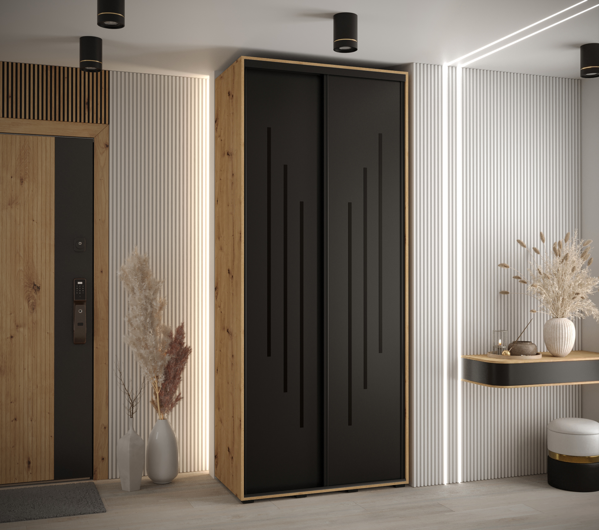 Celková výška skříně je 205,2 cm, šířka 100 cm a hloubka 45 cm. S těmito rozměry se skříň snadno vejde do různých prostorů a dodá vašemu interiéru moderní vzhled.