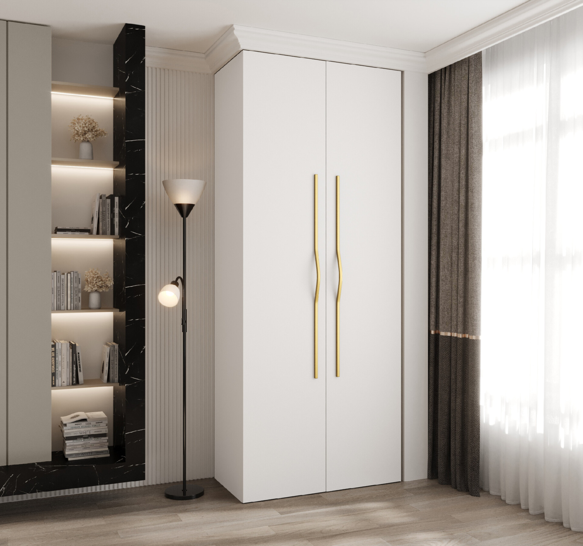 - Úchyty: Kovové úchyty v černé nebo zlaté barvě, které doplňují celkový design skříně.