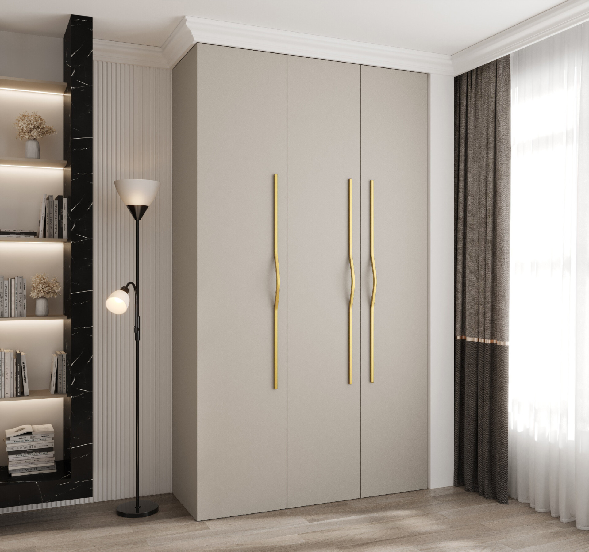 - Úchyty: Kovové úchyty v elegantní zlaté barvě dodávají skříni moderní vzhled.