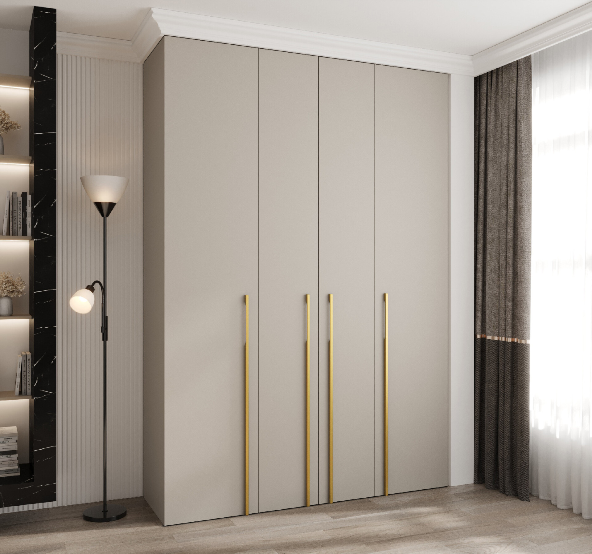 - Praktické úchyty: Kovové úchyty jsou dostupné v černé nebo zlaté barvě, což dodává skříni elegantní vzhled.