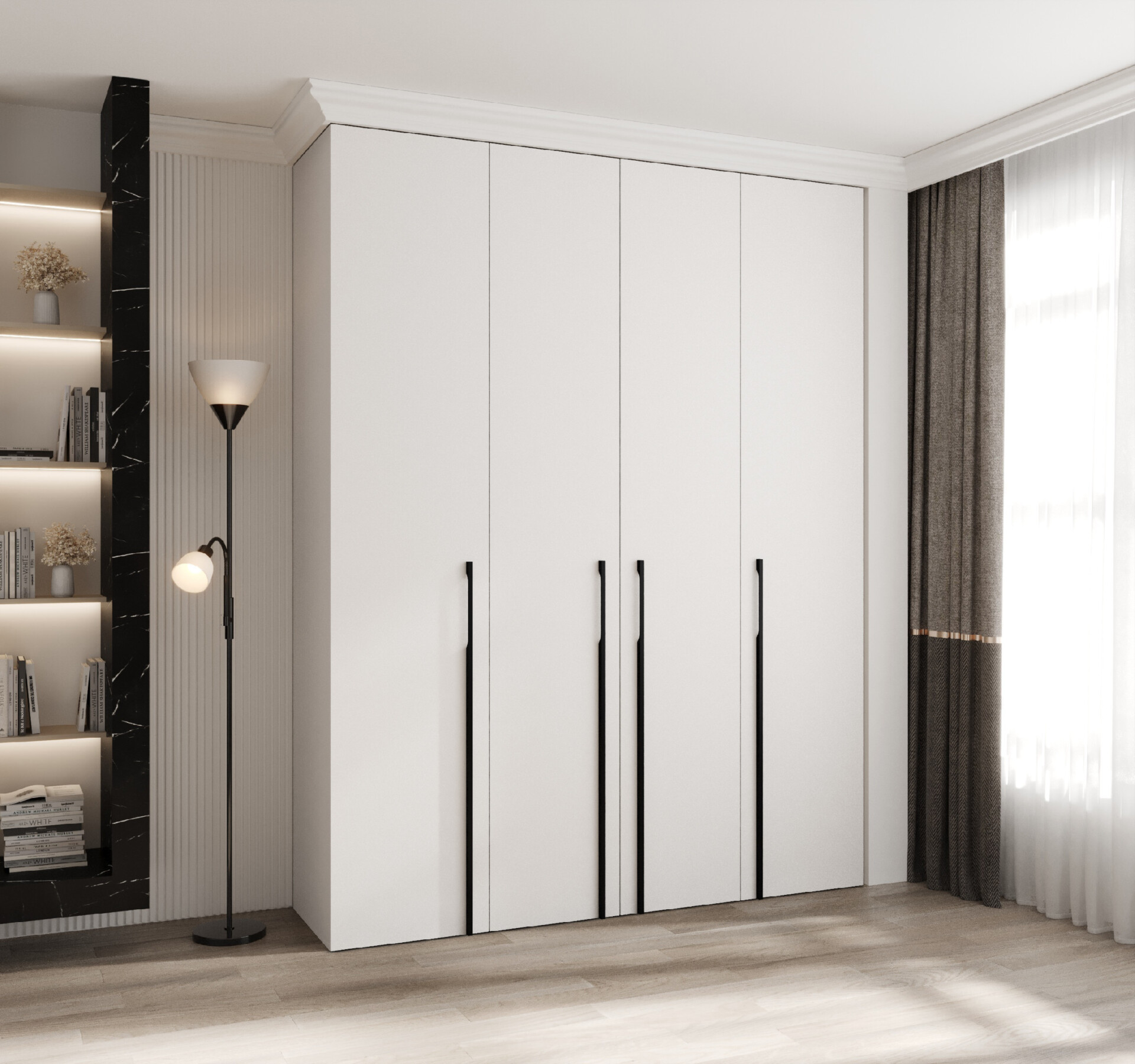 - Designové úchyty: Kovové úchyty v černé barvě doplňují elegantní vzhled skříně.