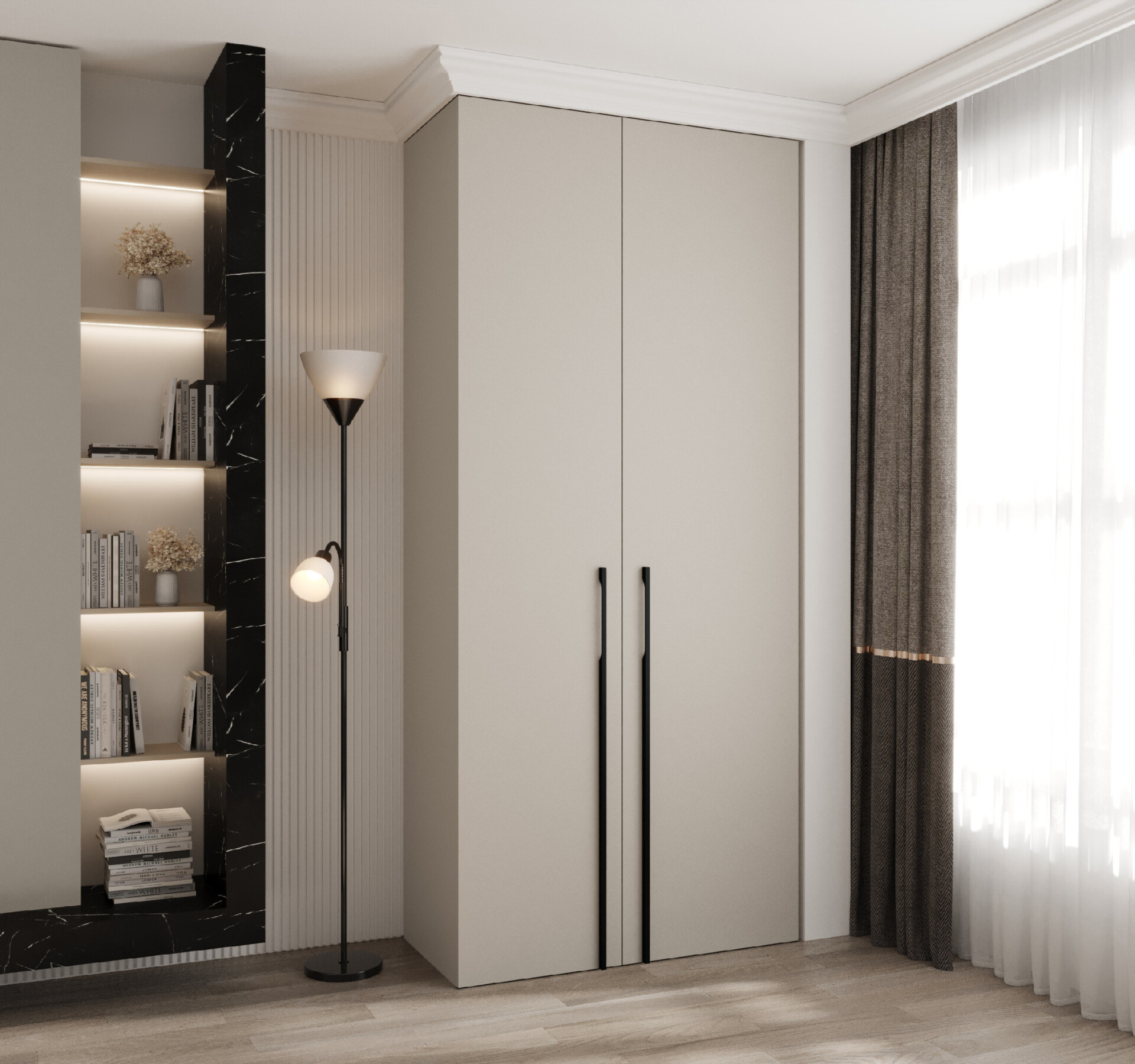 - Úchyty: Kovové úchyty v černé nebo zlaté barvě dodávají skříni moderní vzhled.