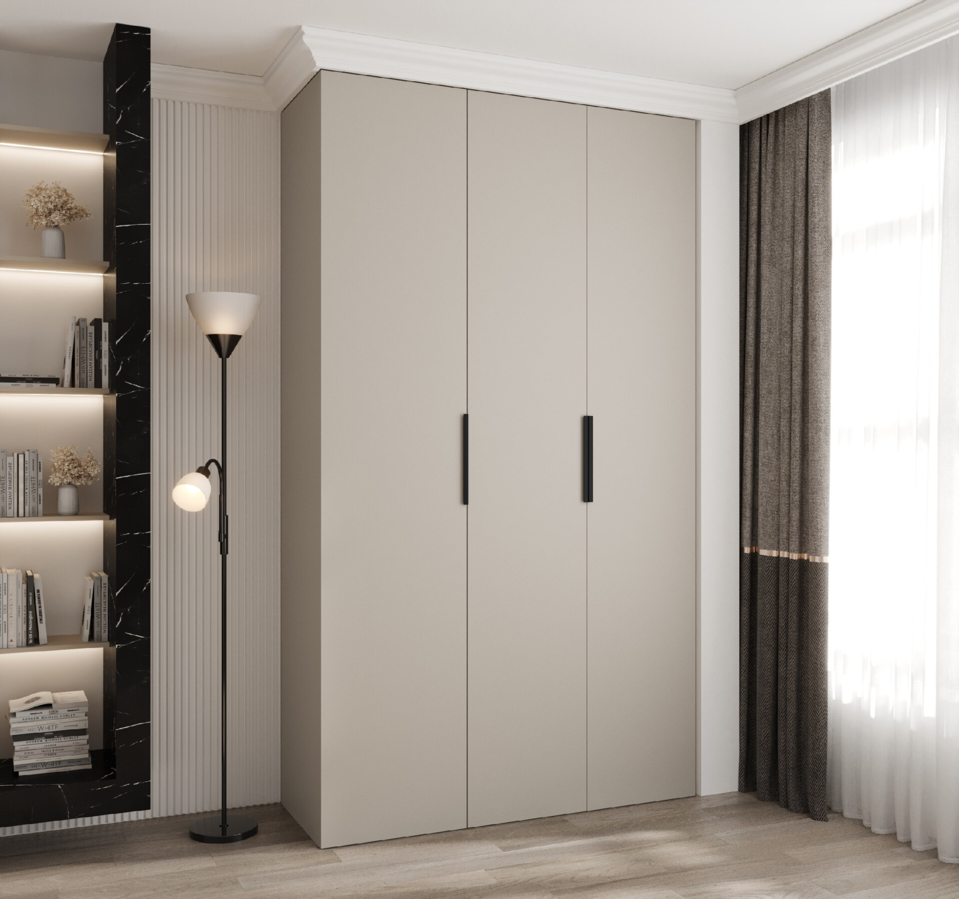 Skříň je dostupná v elegantním odstínu kašmír, který se skvěle hodí do různých interiérů. Kombinace s černými úchyty vytváří moderní a stylový vzhled.