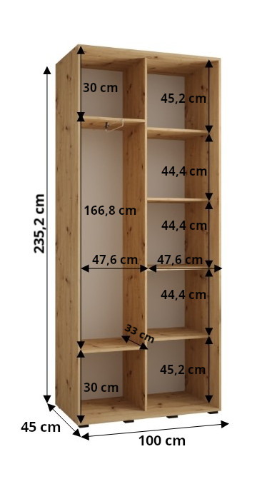 Celková výška skříně je 235,2 cm, což zajišťuje dostatek prostoru pro všechny vaše oděvy a doplňky. Díky promyšlenému designu a kvalitním materiálům je šatní skříň Dakota 1 nejen praktická, ale také esteticky příjemná.