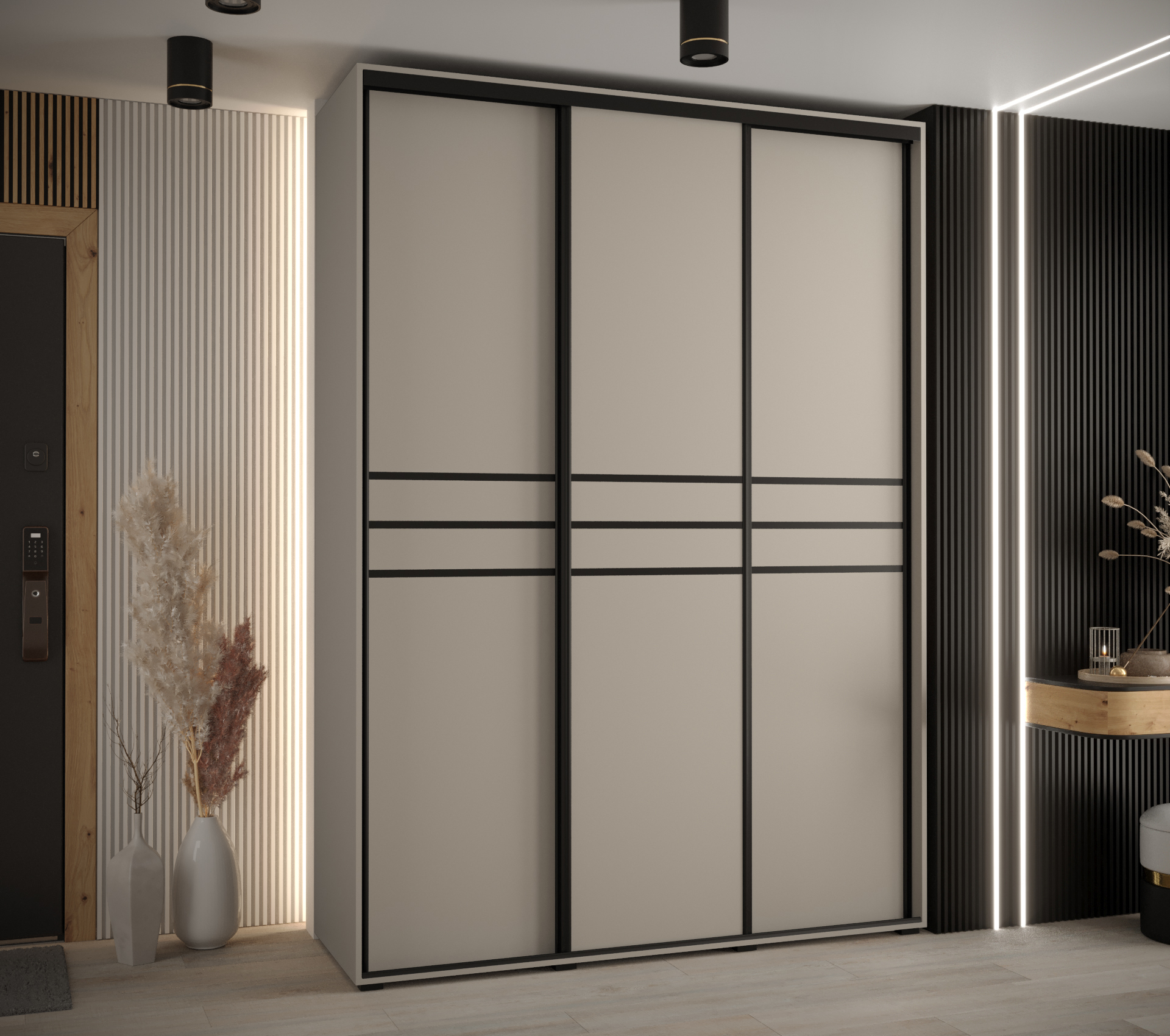Šatní skříň Dakota 10 nabízí tři barevné varianty lišt a úchytů: černou, zlatou a stříbrnou. Korpus a dveře jsou v elegantní barvě kašmír, která se hodí do jakéhokoliv interiéru. Ozdobné pásky na posuvných dveřích dodávají skříni moderní vzhled a umožňují vám přizpůsobit si skříň podle vlastního vkusu.