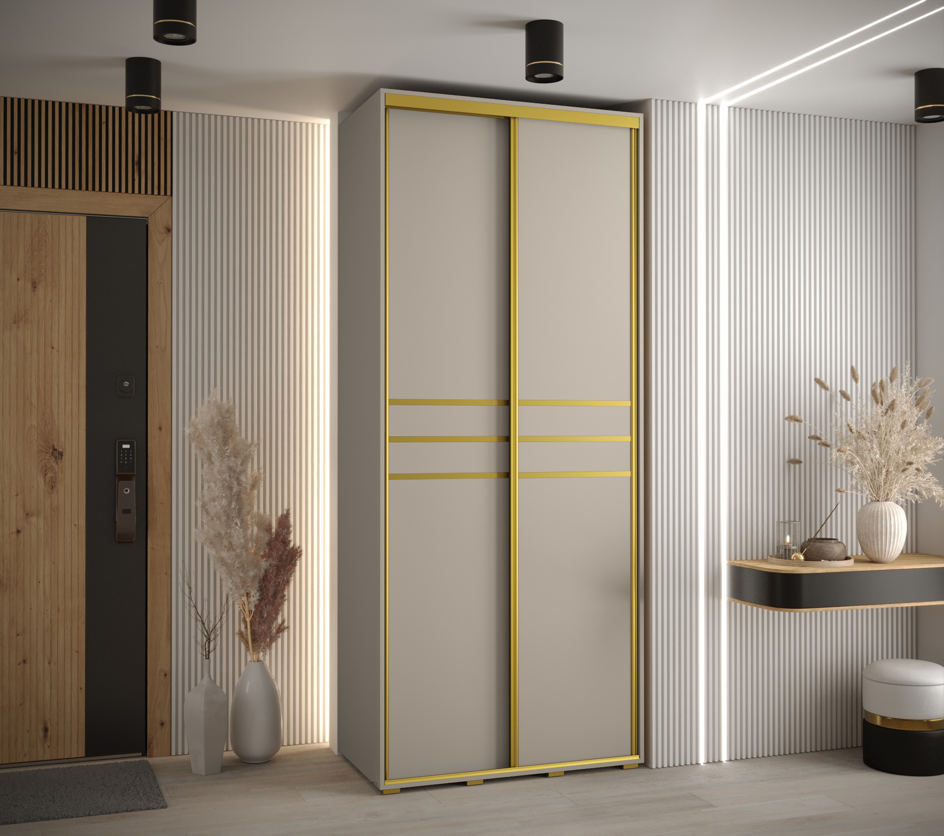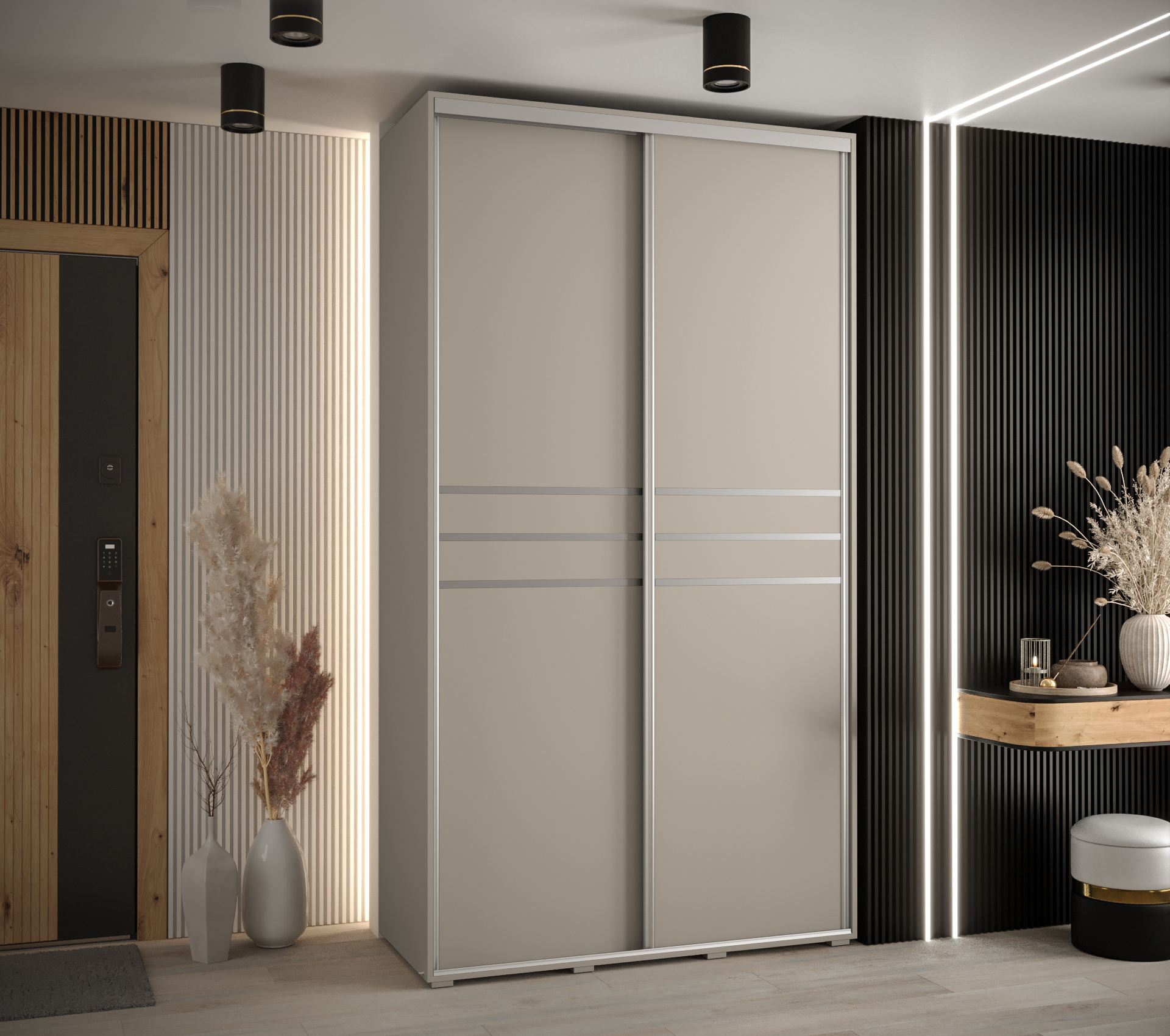 - Stříbrné pásky a úchyty: Moderní design doplňují stříbrné lišty a úchyty, které dodávají skříni elegantní vzhled.