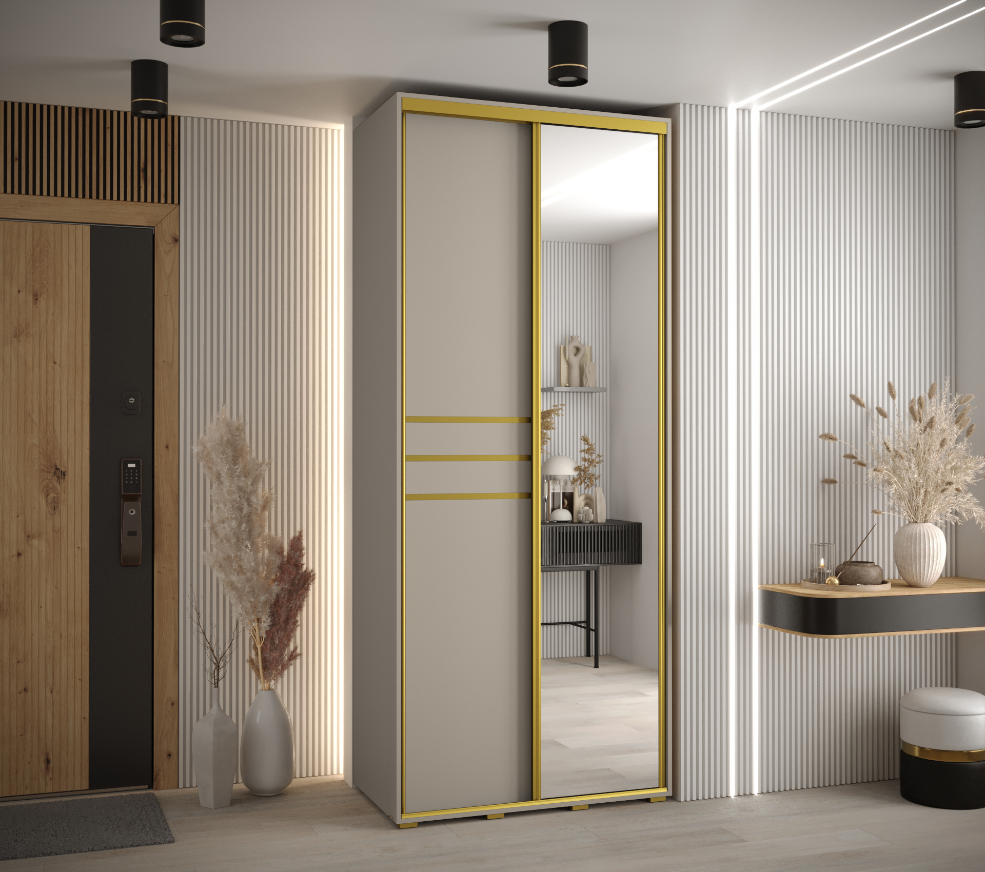 Šatní skříň Dakota 11 je k dispozici v několika barevných variantách, včetně elegantní kašmírové s ozdobnými zlatými pásky. Tato kombinace barev a materiálů dodává skříni moderní vzhled, který se hodí do různých interiérů.