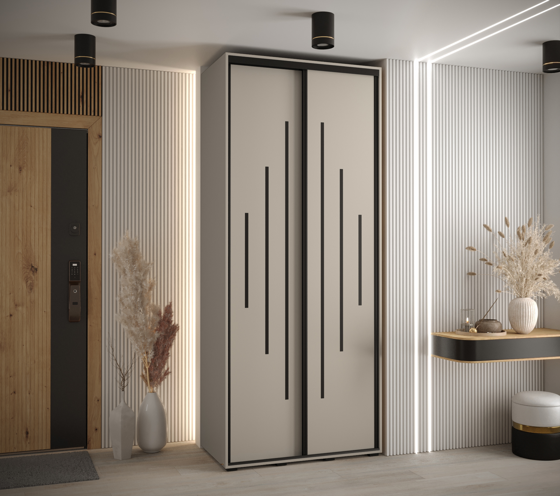 - Lišty a rukojeti: Ocelové prvky přidávají na moderním vzhledu skříně.