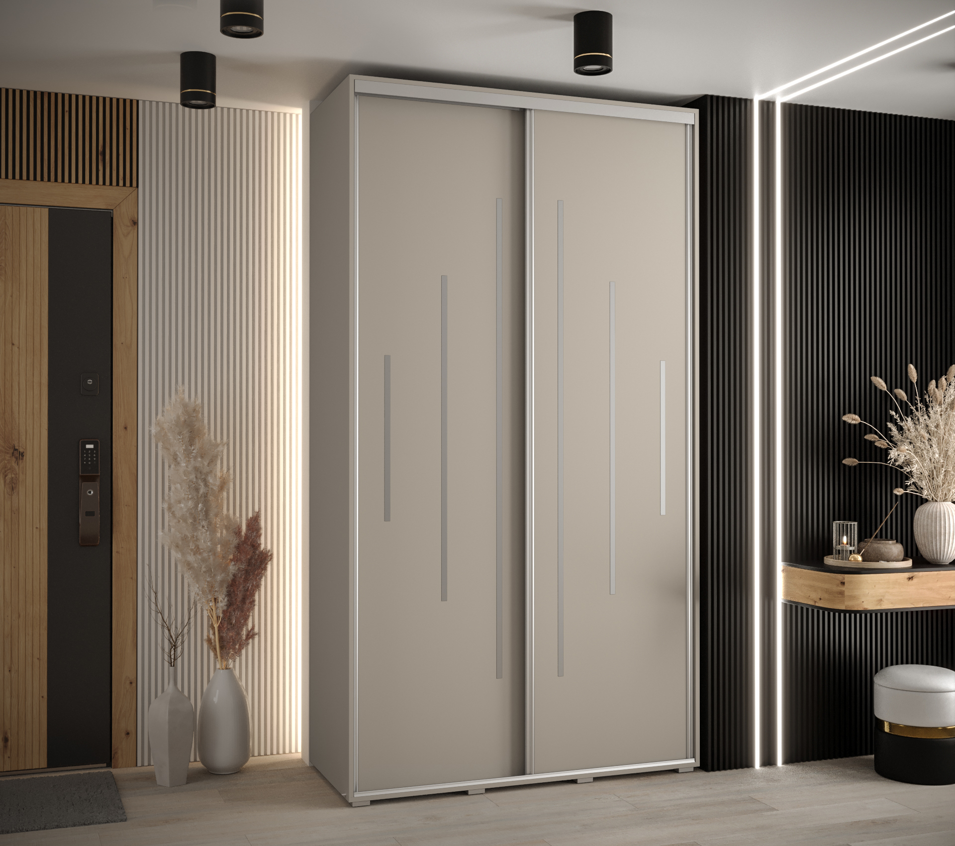Korpus a dveře skříně jsou dostupné v elegantní kašmír barvě, která se snadno kombinuje s různými interiérovými styly. Můžete si také vybrat z dalších barevných variant lišt a úchytek, jako jsou zlatá, stříbrná a černá.