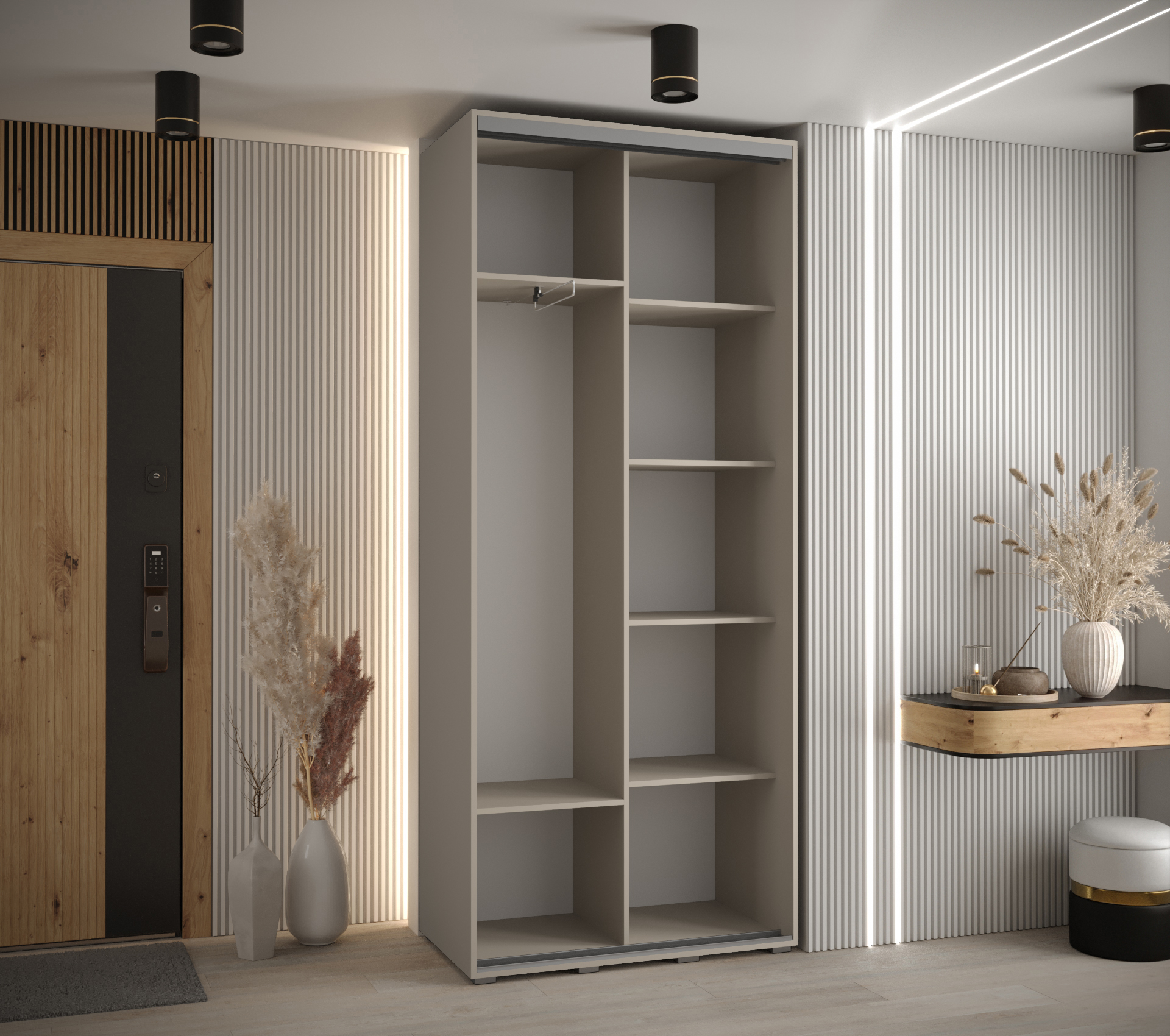 - Ozdobné pásky: Posuvné dveře jsou zdobeny plastovými pásky, které dodávají skříni moderní vzhled.