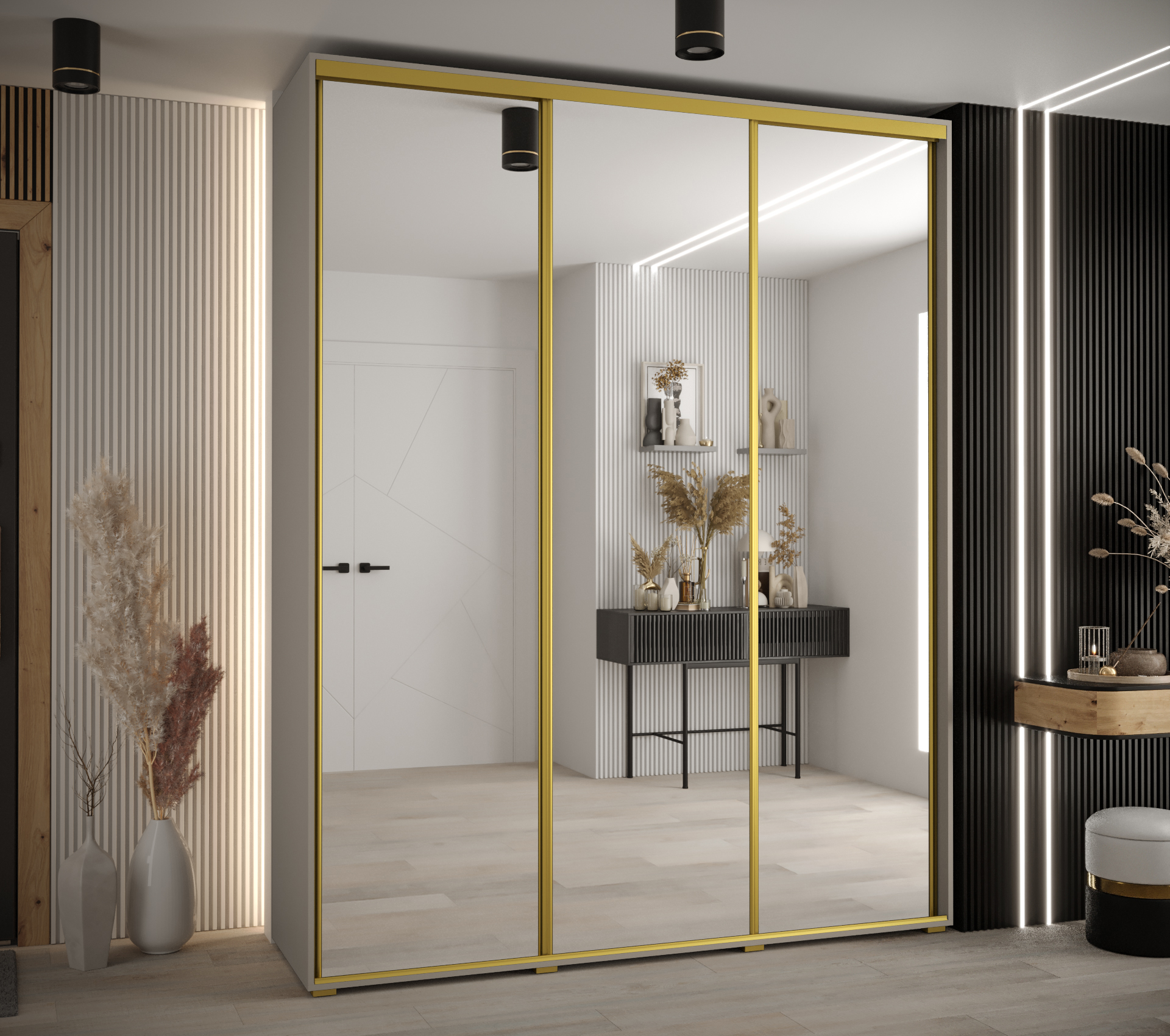 Vzhled skříně je moderní a nadčasový, což ji činí vhodnou do různých interiérů. Korpus a dveře jsou v barvě kašmíru, doplněné o zrcadlo, které opticky zvětší prostor. Pásky a úchyty ve zlaté barvě dodávají skříni elegantní vzhled.