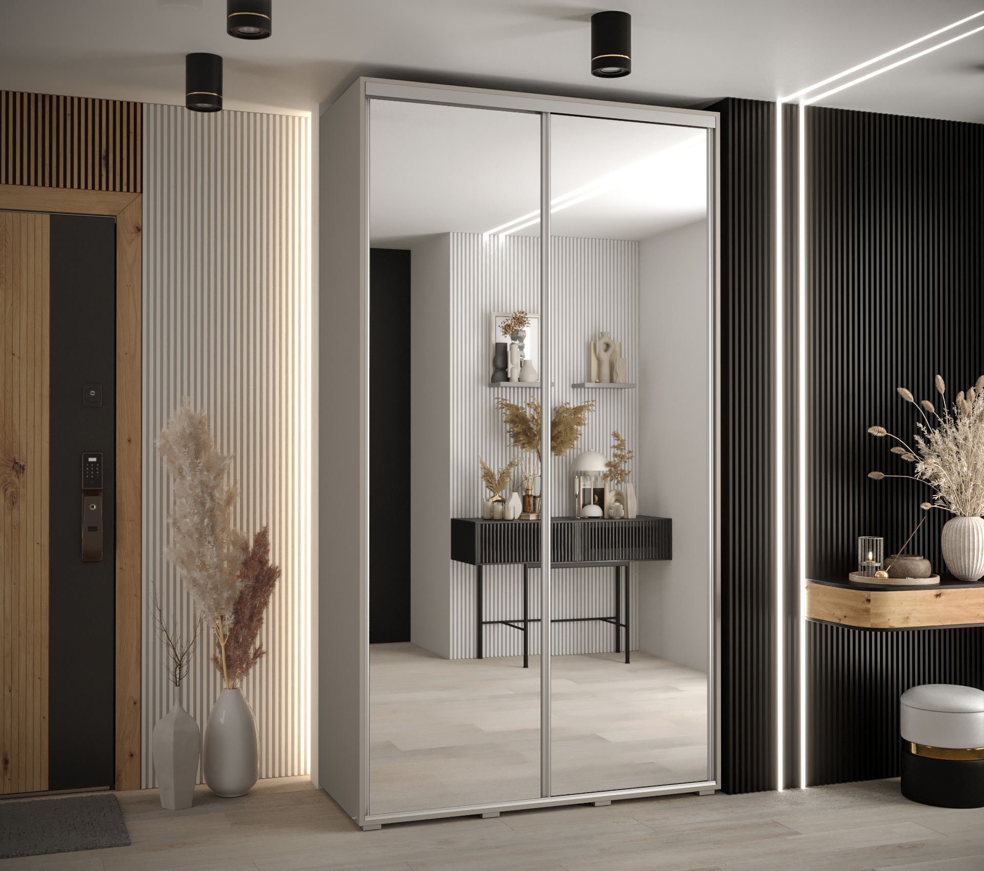 Skříň je dostupná v několika barevných variantách, včetně elegantního kašmíru a zrcadlových dveří, které opticky zvětší prostor a dodají mu na vzdušnosti.