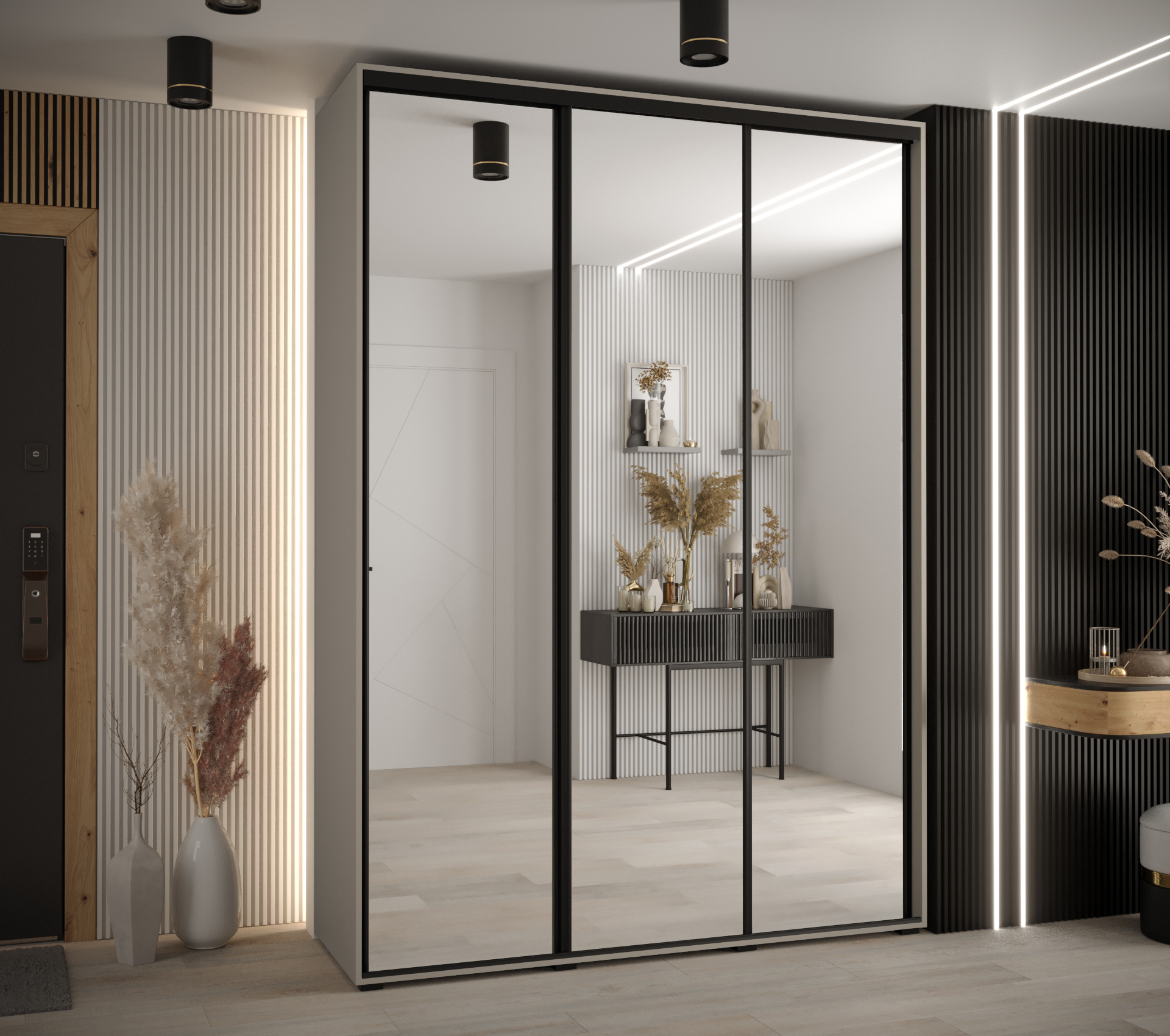 Šatní skříň Dakota 2 je k dispozici v několika barevných variantách, přičemž korpus a dveře jsou v elegantní kašmírové barvě, doplněné o zrcadlo. Černé úchyty a lišty dodávají skříni moderní vzhled, který se hodí do různých interiérů. Zvolte si také z variantních úchytných lišt: zlatá, stříbrná nebo černá.