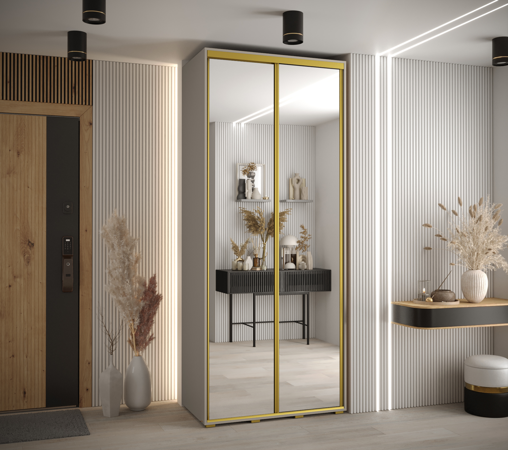 Kromě kašmírové barvy korpusu a zrcadlových dveří si můžete vybrat z několika variant ozdobných lišt a úchytek, včetně zlaté, stříbrné a černé. Tímto způsobem můžete snadno sladit skříň s ostatním nábytkem ve vaší domácnosti.