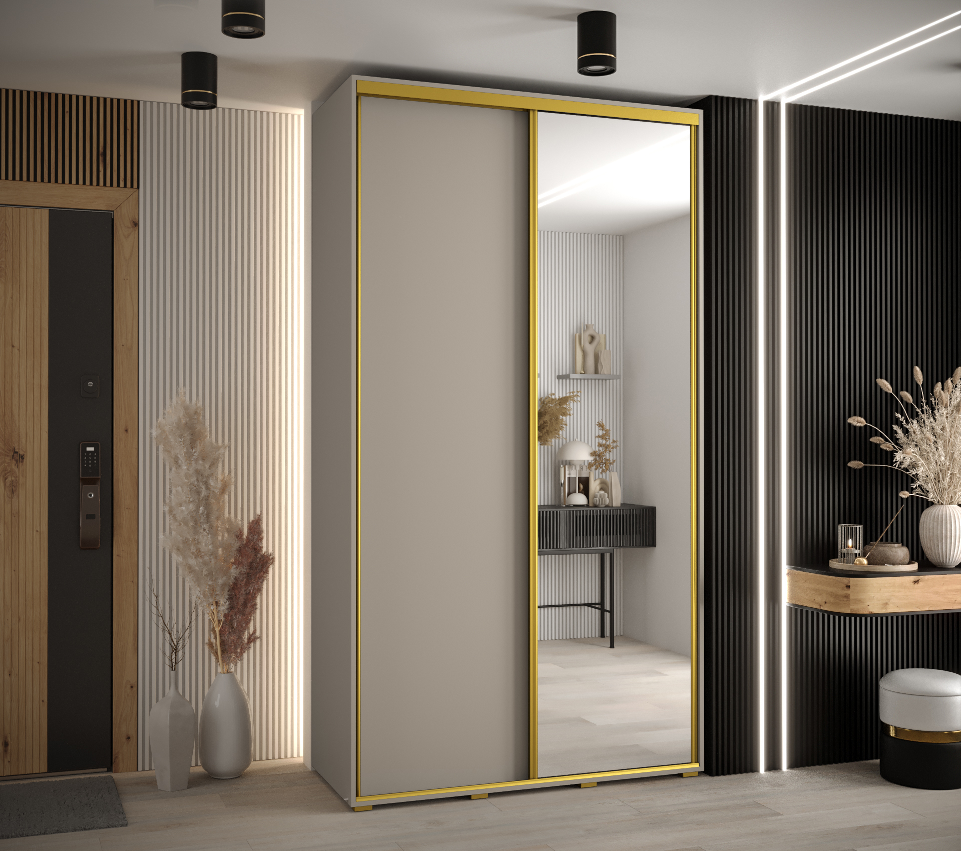 V základní variantě skříň obsahuje dvě výsuvné tyče a několik polic, které lze variabilně uspořádat podle vašich potřeb. Toto flexibilní uspořádání umožňuje efektivně organizovat oblečení a doplňky.