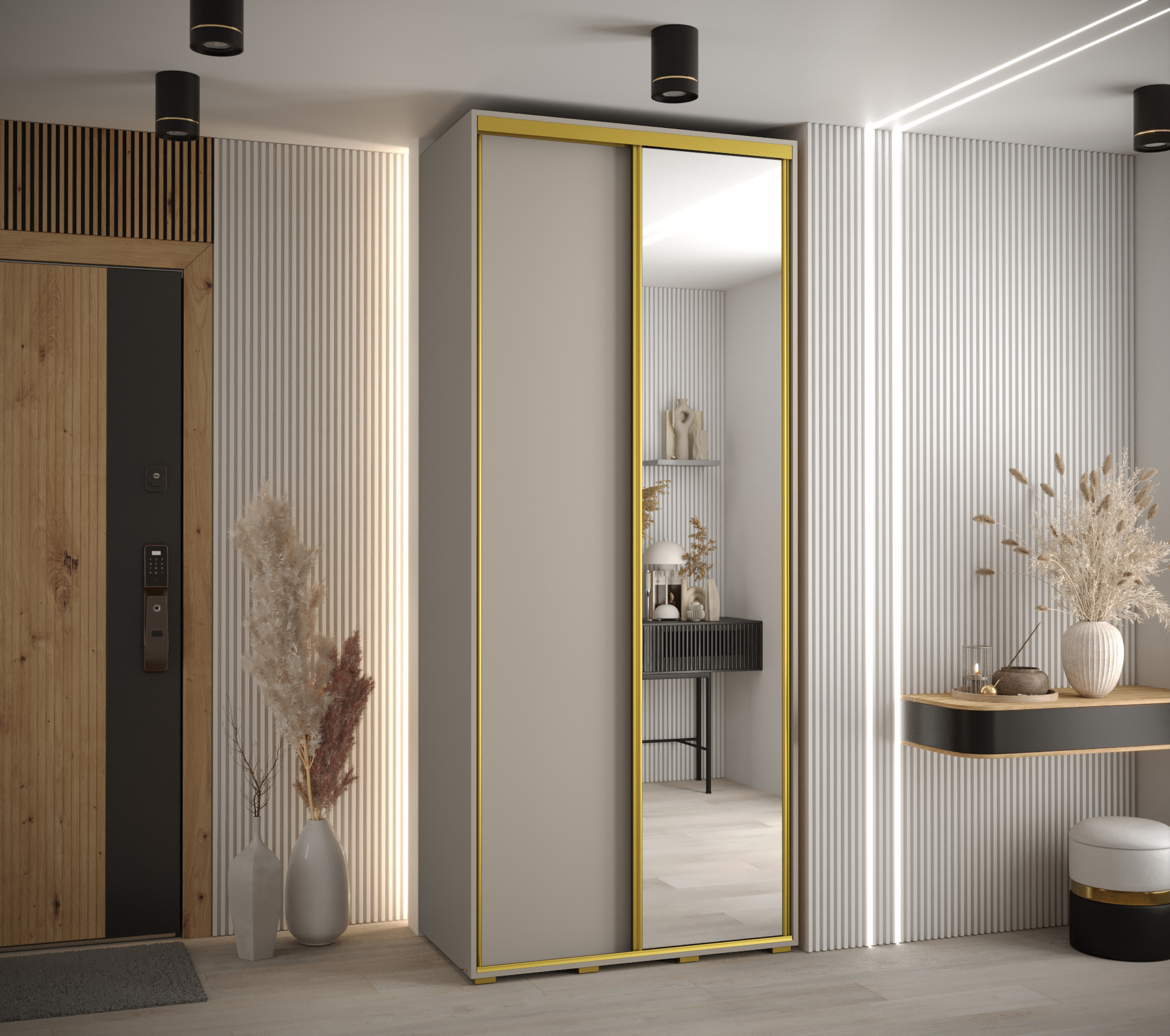 Šatní skříň Dakota 3 je dostupná ve třech barevných variantách lišt: zlatá, stříbrná a černá, což vám umožní vybrat si tu správnou kombinaci pro váš interiér.