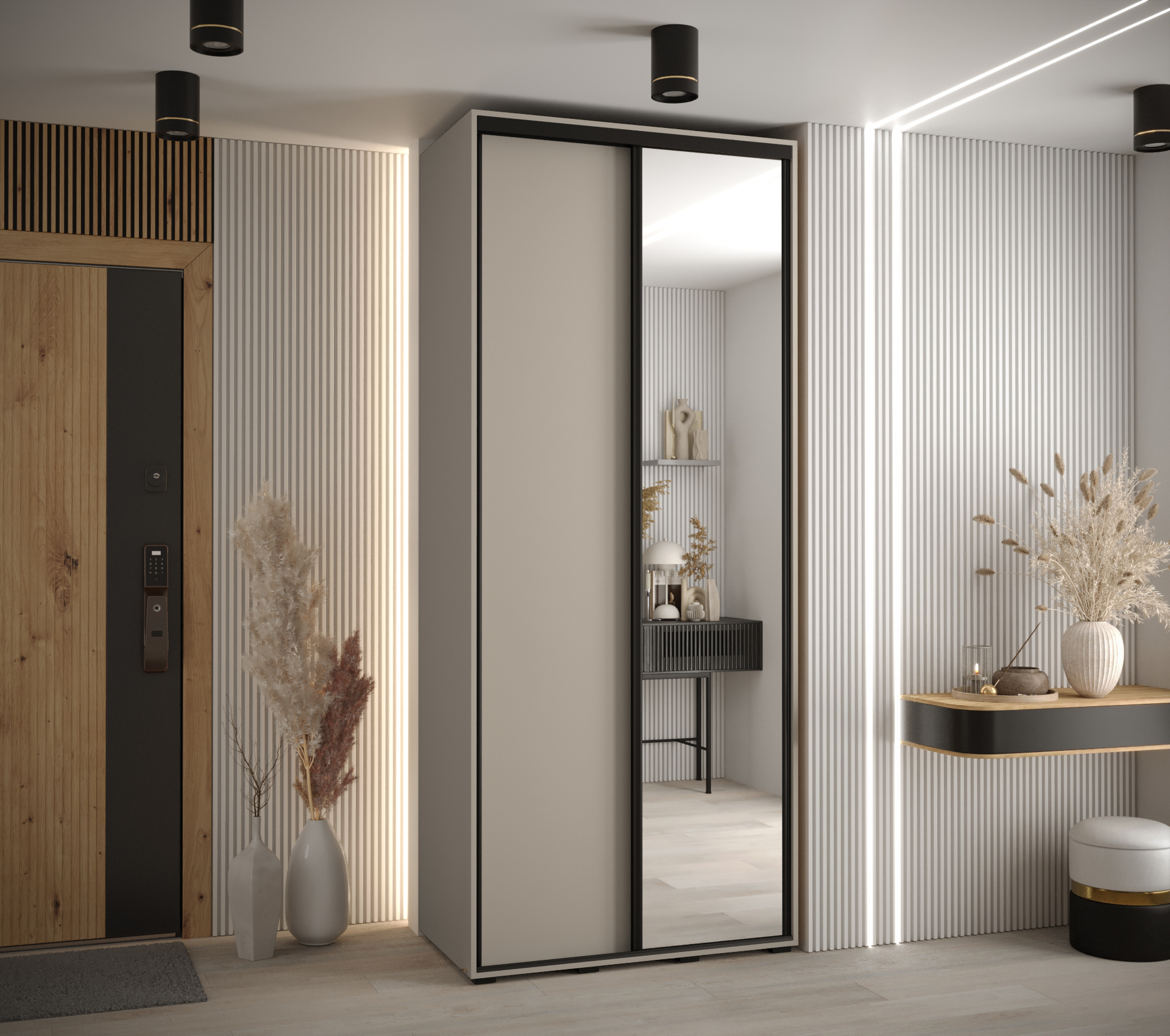 Tato skříň se pyšní moderním vzhledem, který kombinuje kašmírovou barvu korpusu s elegantním zrcadlem na dveřích. Černé úchyty dodávají skříni šmrnc a podtrhují její stylový design.