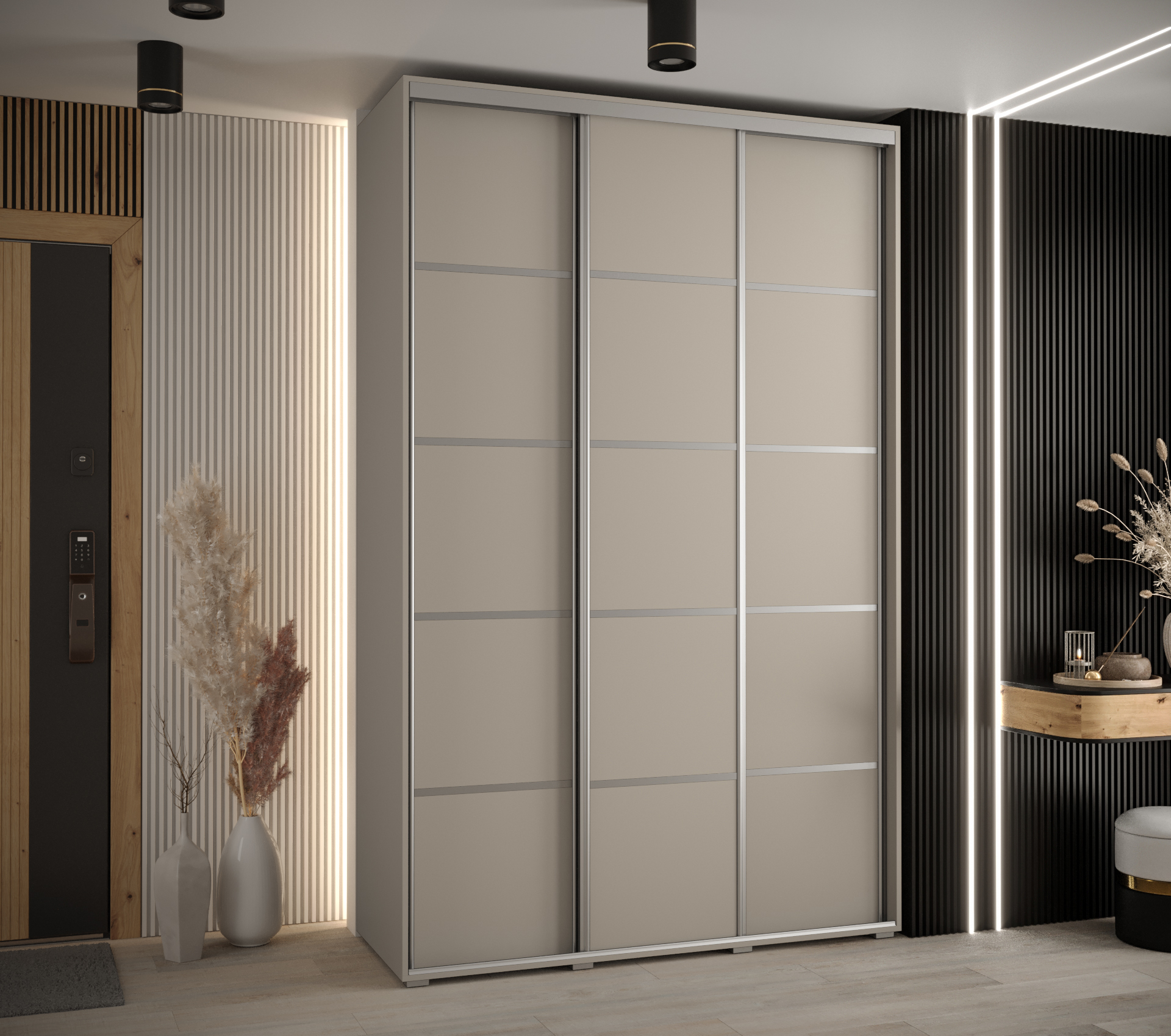 Šatní skříň Dakota 4 přichází v moderním kašmírovém provedení, které se hodí do jakéhokoliv interiéru. Stříbrné úchyty a ozdobné pásky dodávají skříni elegantní vzhled. Kromě kašmírové barvy si můžete vybrat i z dalších barevných variant, jako jsou zlatá a černá.
