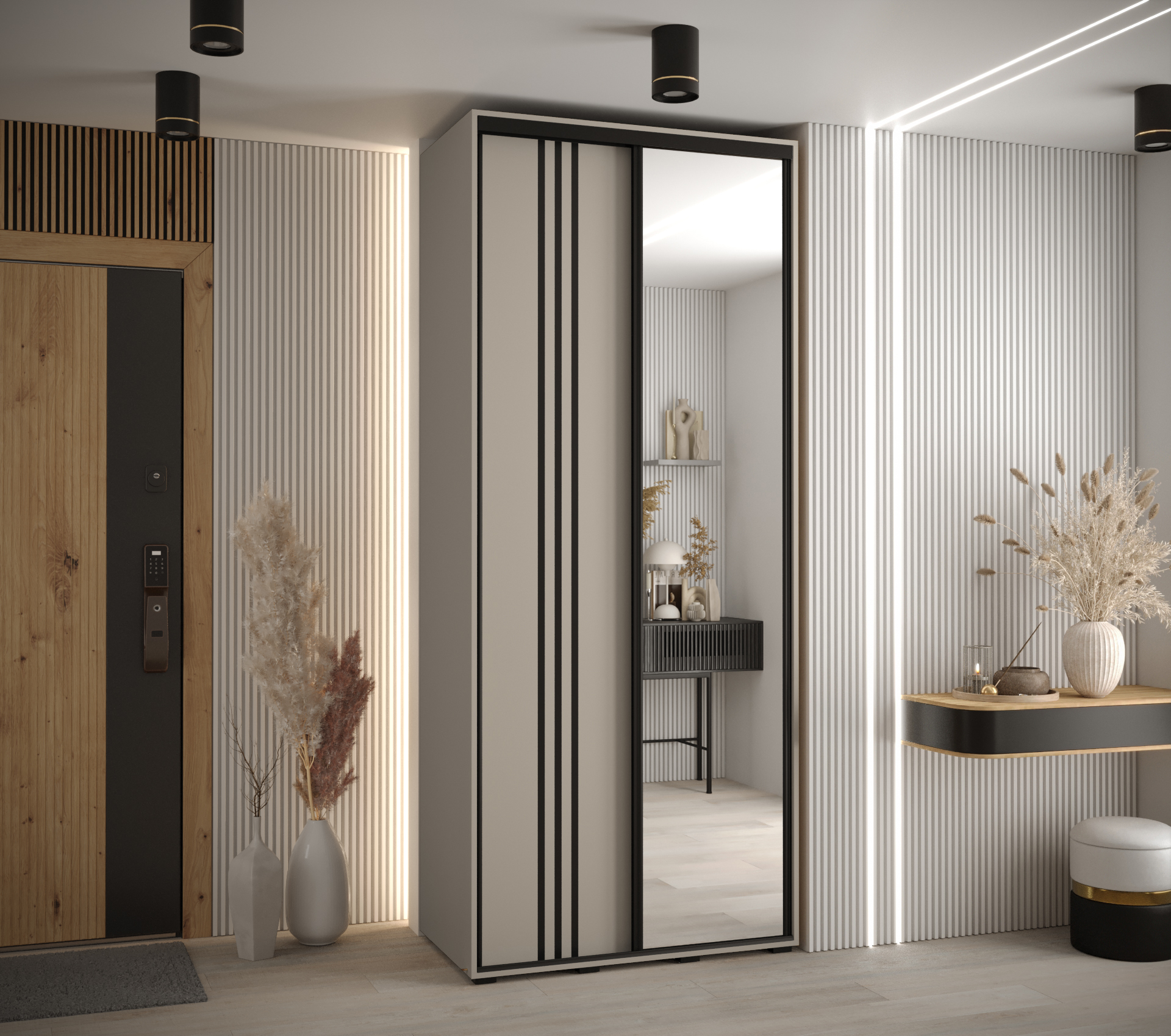 Skříň je k dispozici v elegantní kašmírové barvě, která se snadno kombinuje s různými interiérovými styly. Černé pásky a úchyty dodávají skříni moderní vzhled a praktické využití.