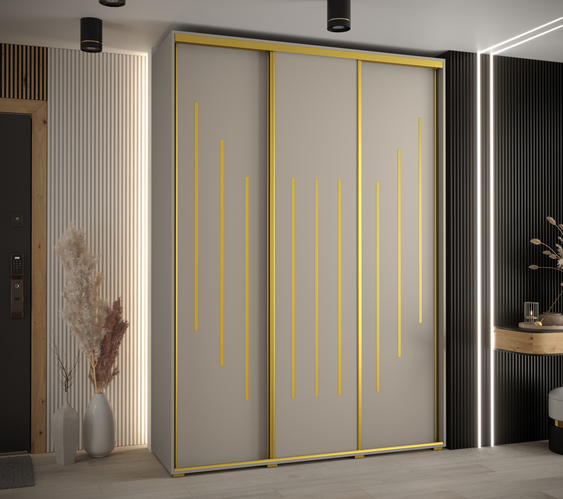 Korpus a dveře skříně jsou v atraktivní kašmírové barvě, zatímco ozdobné lišty a úchyty jsou dostupné ve zlaté, stříbrné a černé variantě. Tato kombinace barev a materiálů zajišťuje, že skříň Dakota 8 se hodí do různých interiérů.