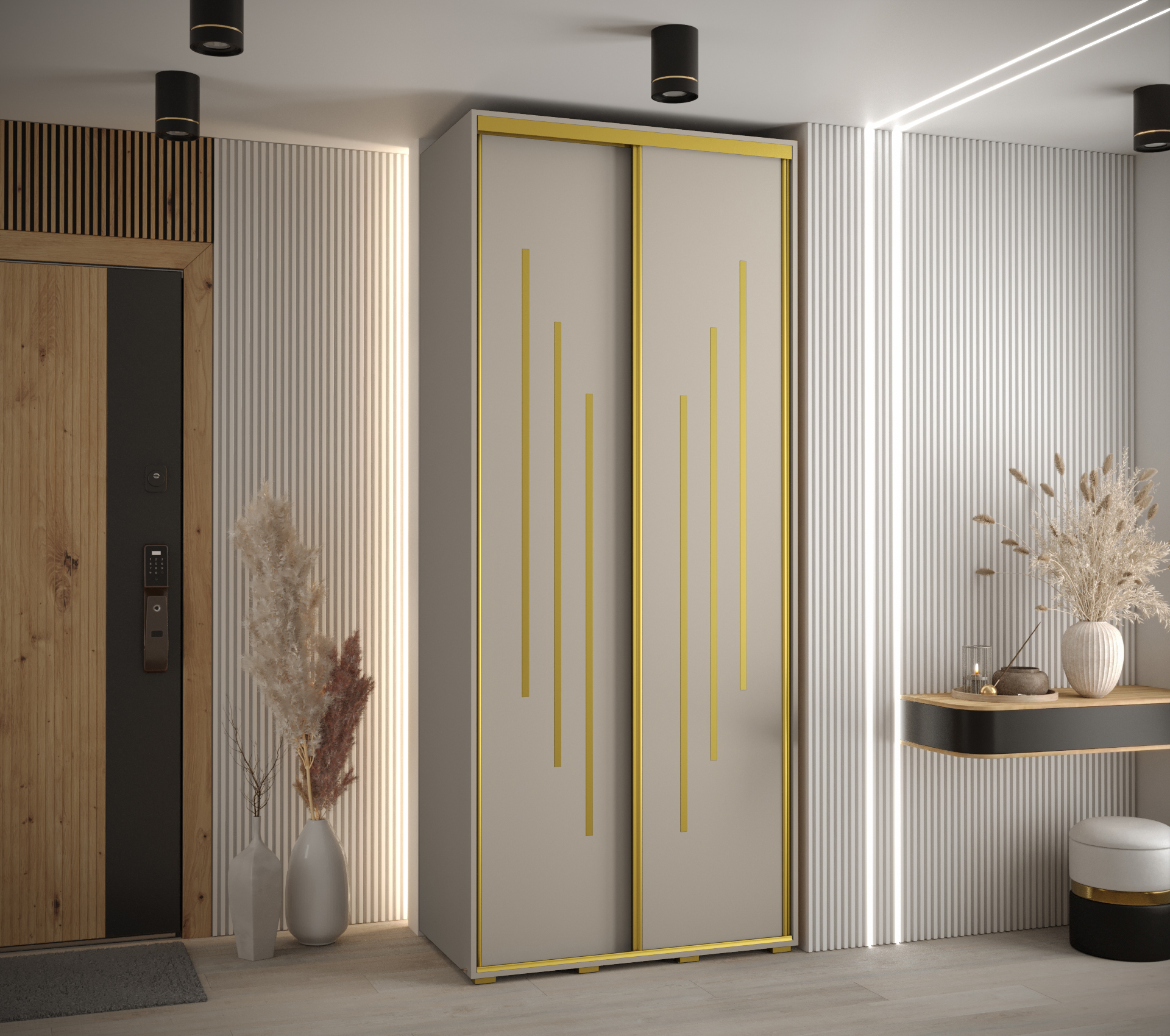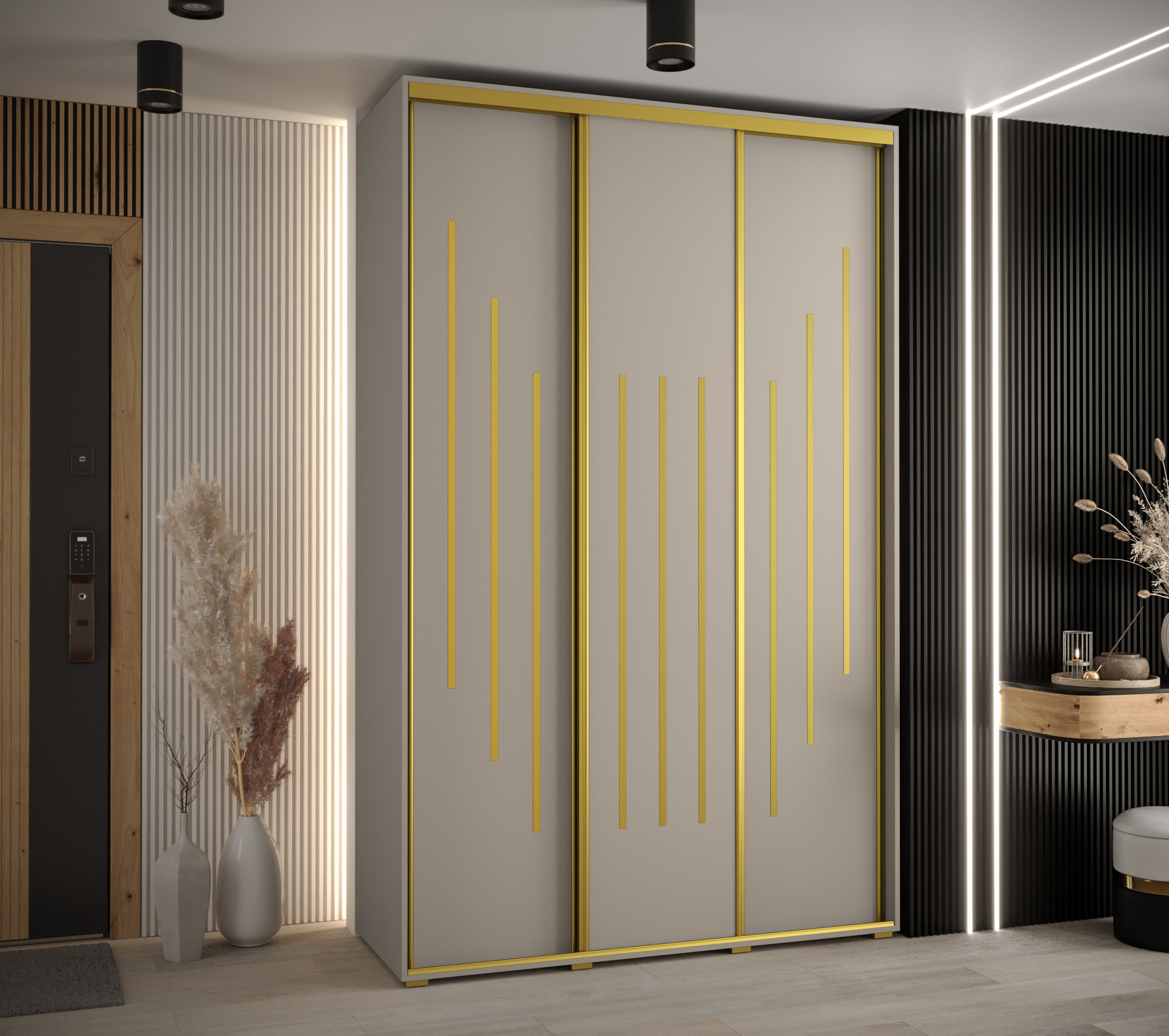 - Estetický design: Skříň je dodávána v elegantní kašmírové barvě, doplněná o zlaté úchyty, které dodávají skříni luxusní vzhled.