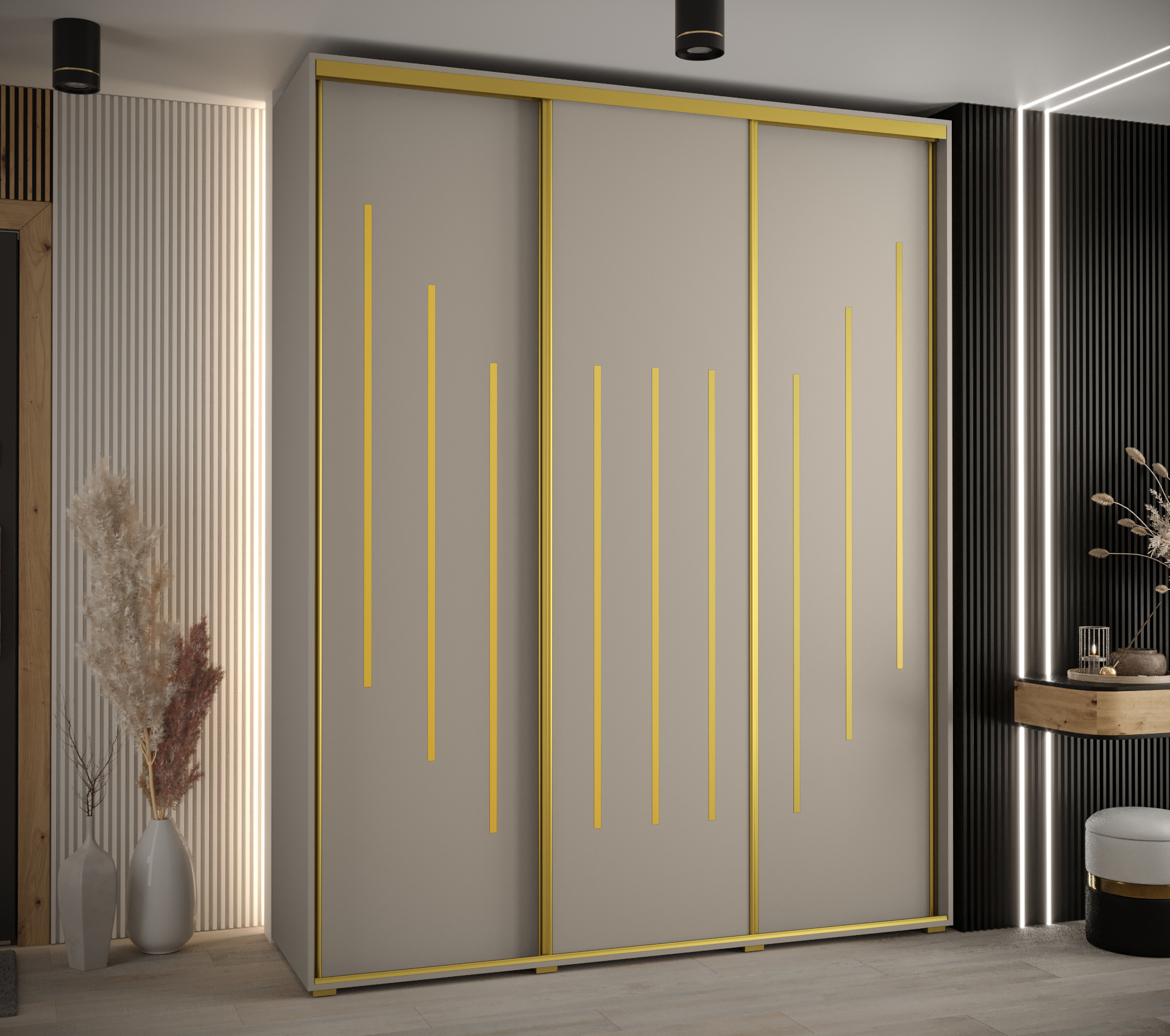 Šatní skříň Dakota 8 je dostupná v elegantní kašmír barvě s ozdobnými lištami v zlaté, stříbrné nebo černé variantě. Tato kombinace dodává skříni moderní a stylový vzhled.