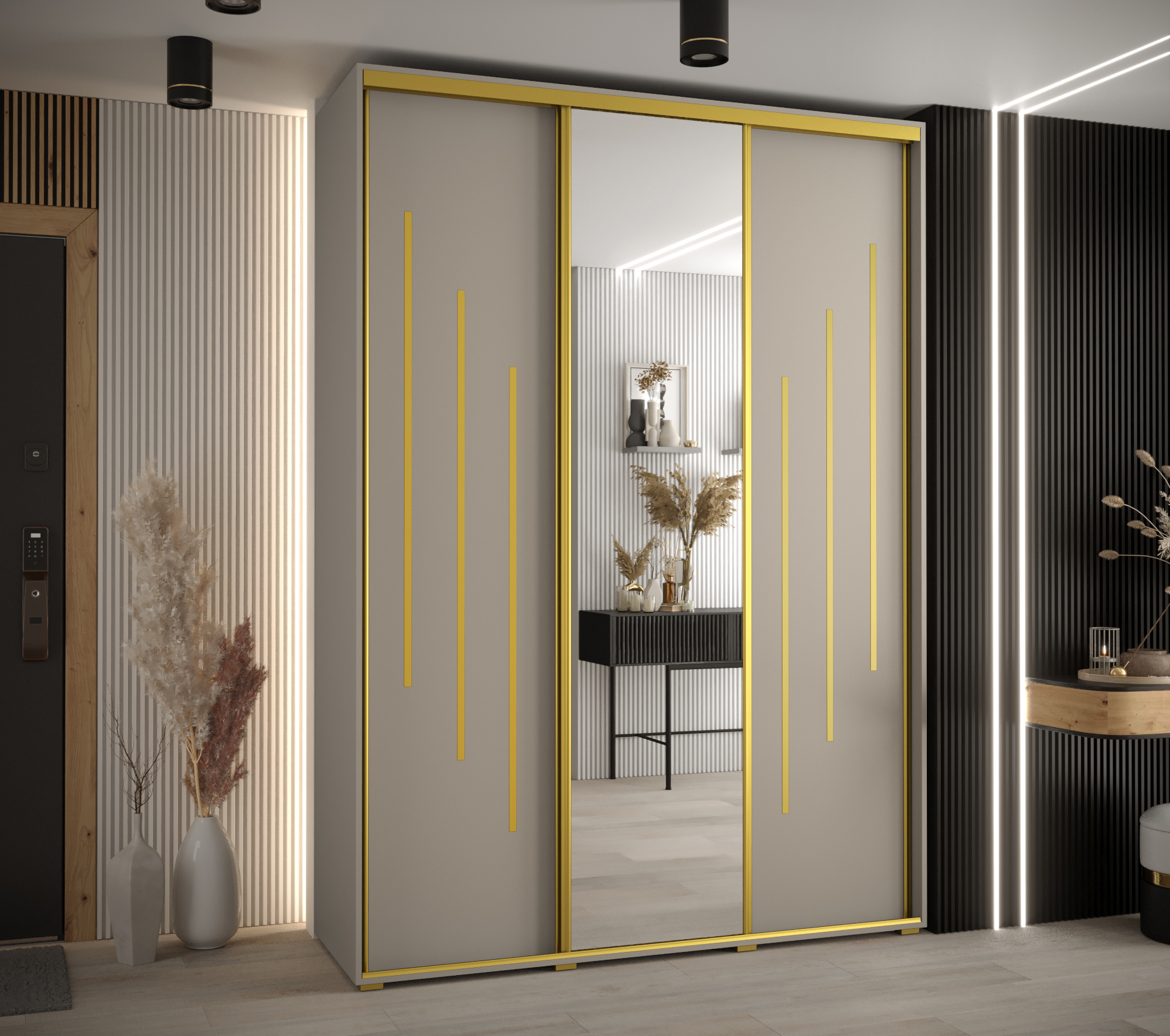 Šatní skříň je k dispozici v několika barevných variantách. Korpus a dveře jsou v elegantní kašmírové barvě, zatímco ozdobné lišty a úchyty jsou ve zlaté barvě, což dodává skříni luxusní vzhled.