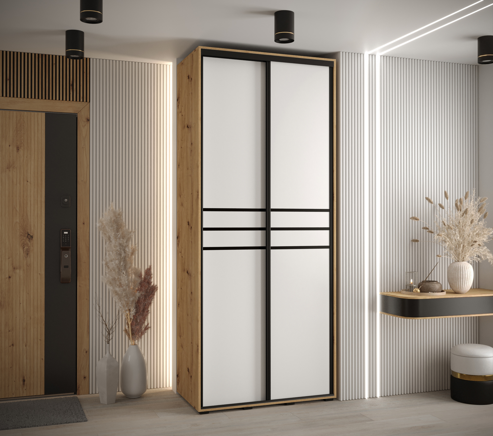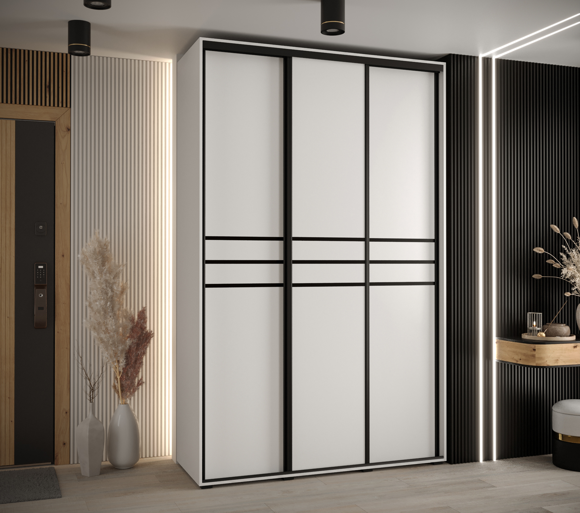 - Estetické detaily: Posuvné dveře jsou ozdobeny plastovými pásky, které dodávají skříni elegantní vzhled.