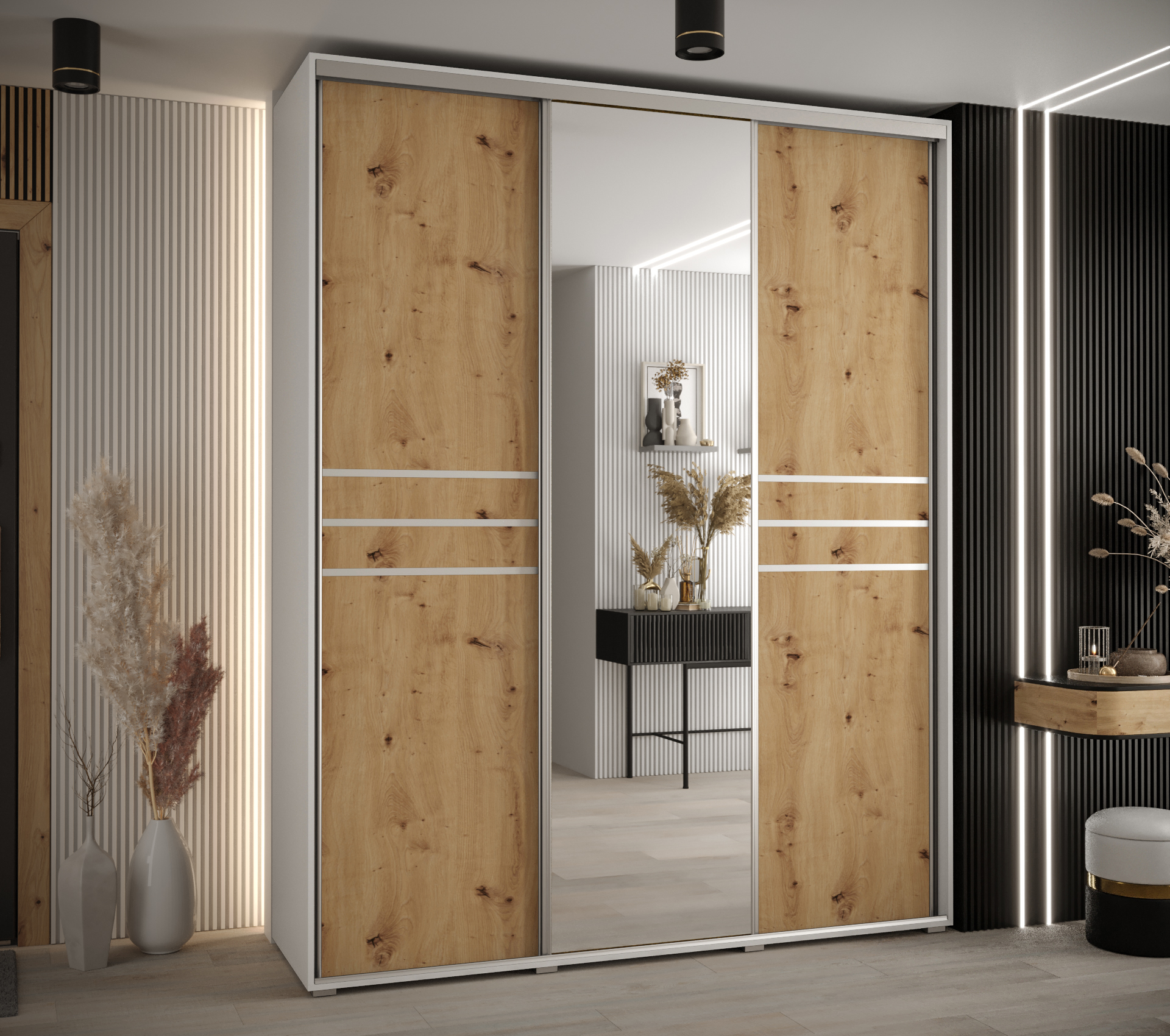 Šatní skříň Davos 11 je dostupná v různých barevných variantách. Korpus může být bílý a dveře v dekoru Dub-Artisan, což je oblíbená kombinace pro moderní interiéry.