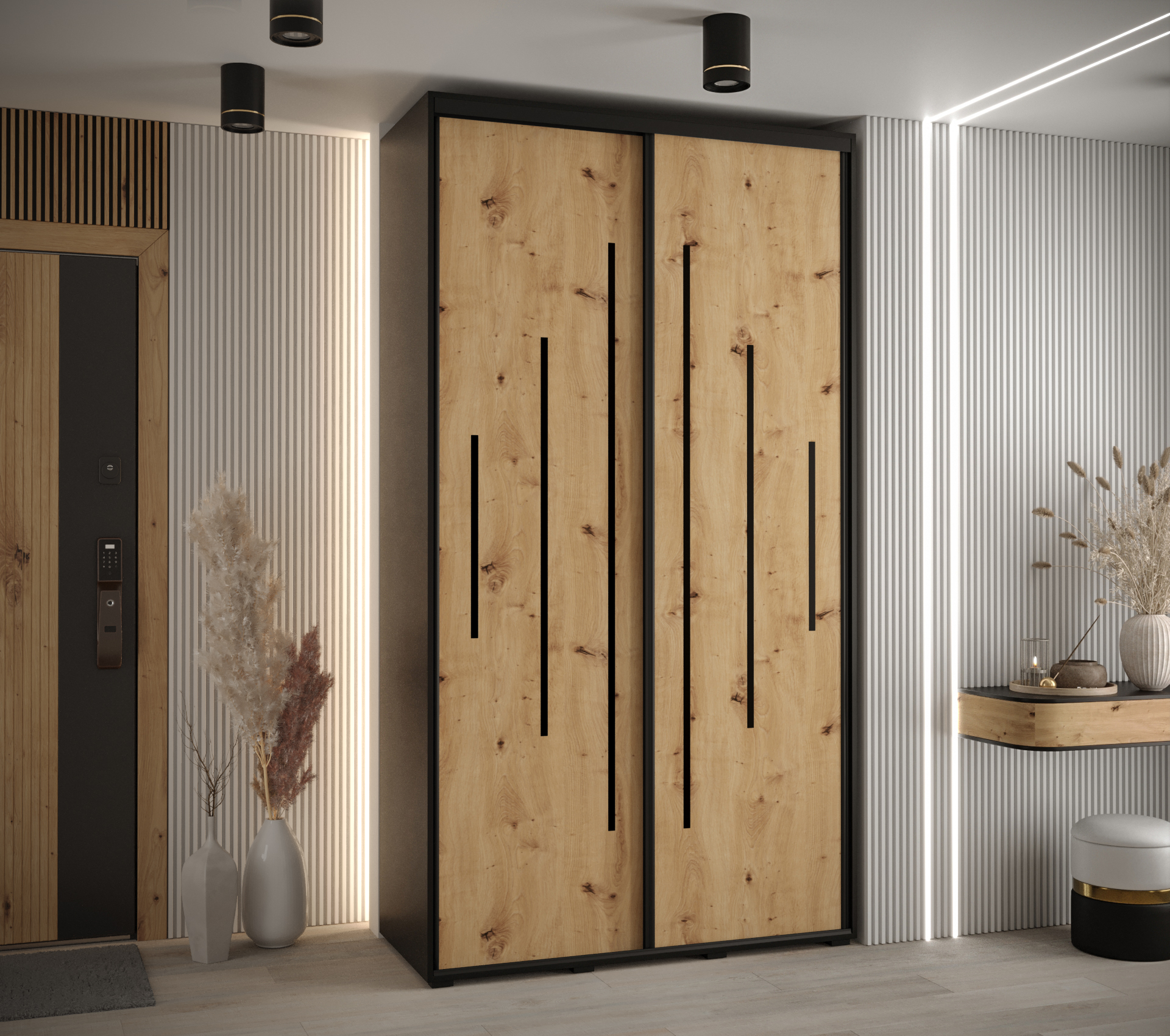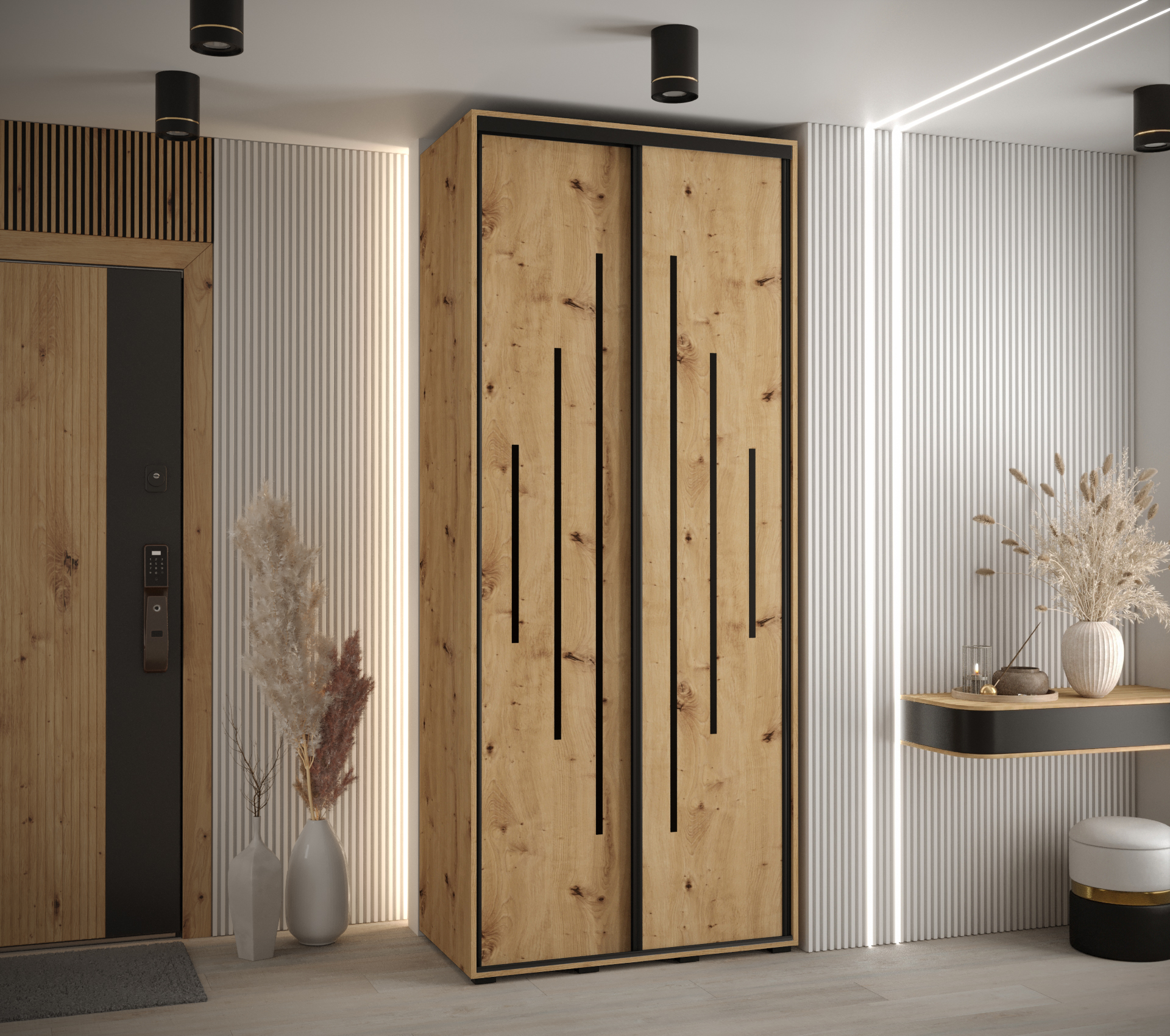 • Ozdobné prvky: Posuvné dveře jsou zdobeny plastovými pásky, které dodávají skříni moderní vzhled.