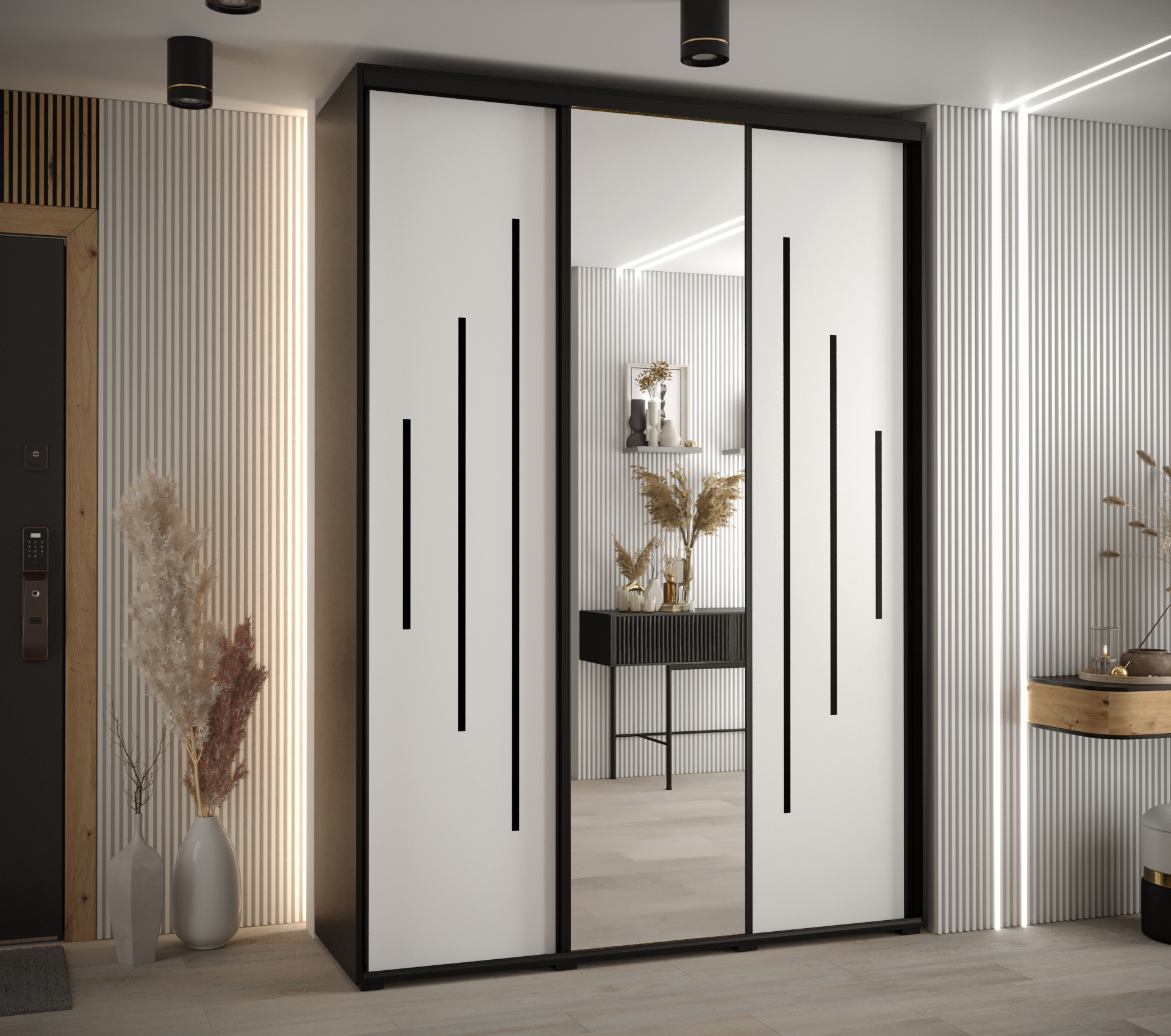 Skříň obsahuje minimálně dvě výsuvné tyče a několik polic, které si můžete přizpůsobit podle vlastních potřeb. Variabilní uspořádání umožňuje personalizaci a maximální využití úložného prostoru.