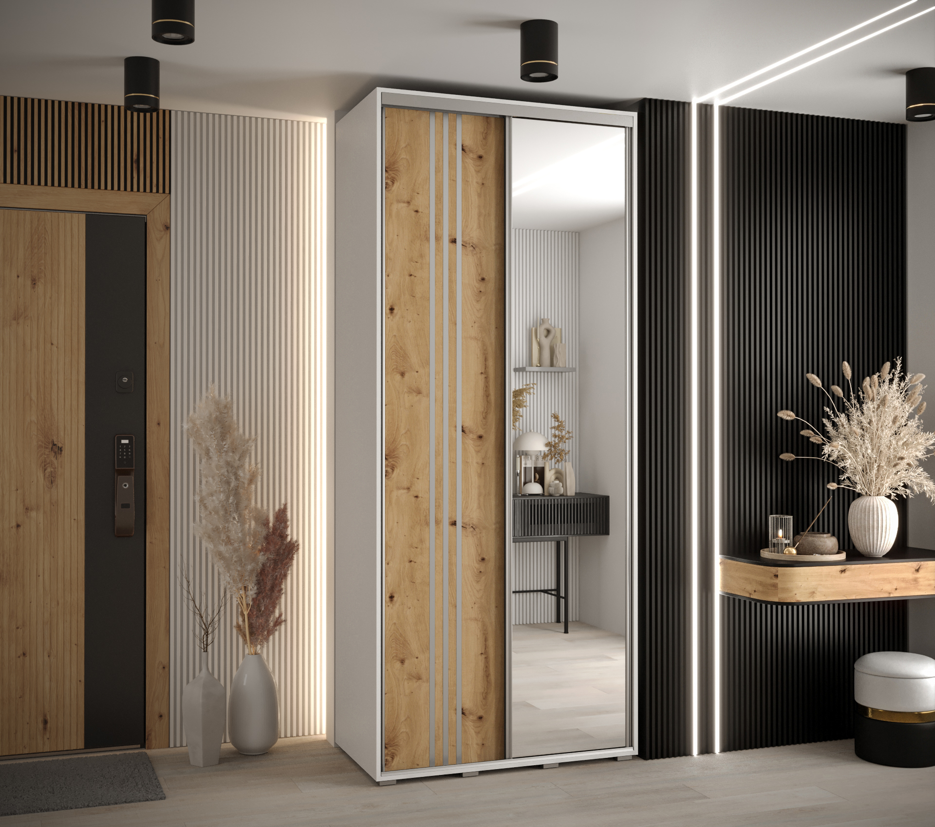 V základní variantě skříň obsahuje minimálně dvě výsuvné tyče a několik polic, které si můžete uspořádat podle vlastních potřeb. Variabilní uspořádání vám umožní přizpůsobit vnitřní prostor tak, aby vyhovoval vašim potřebám.