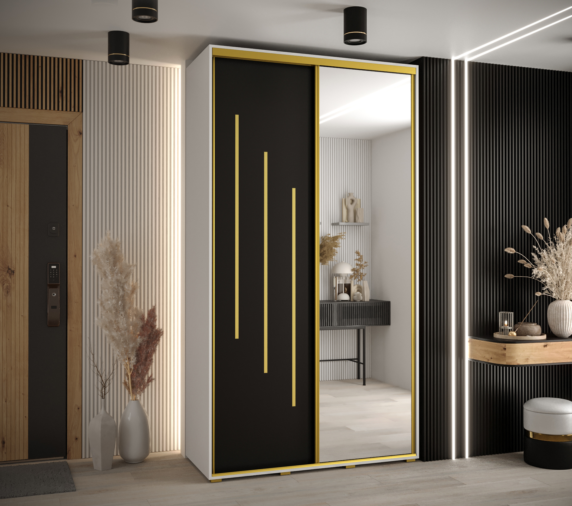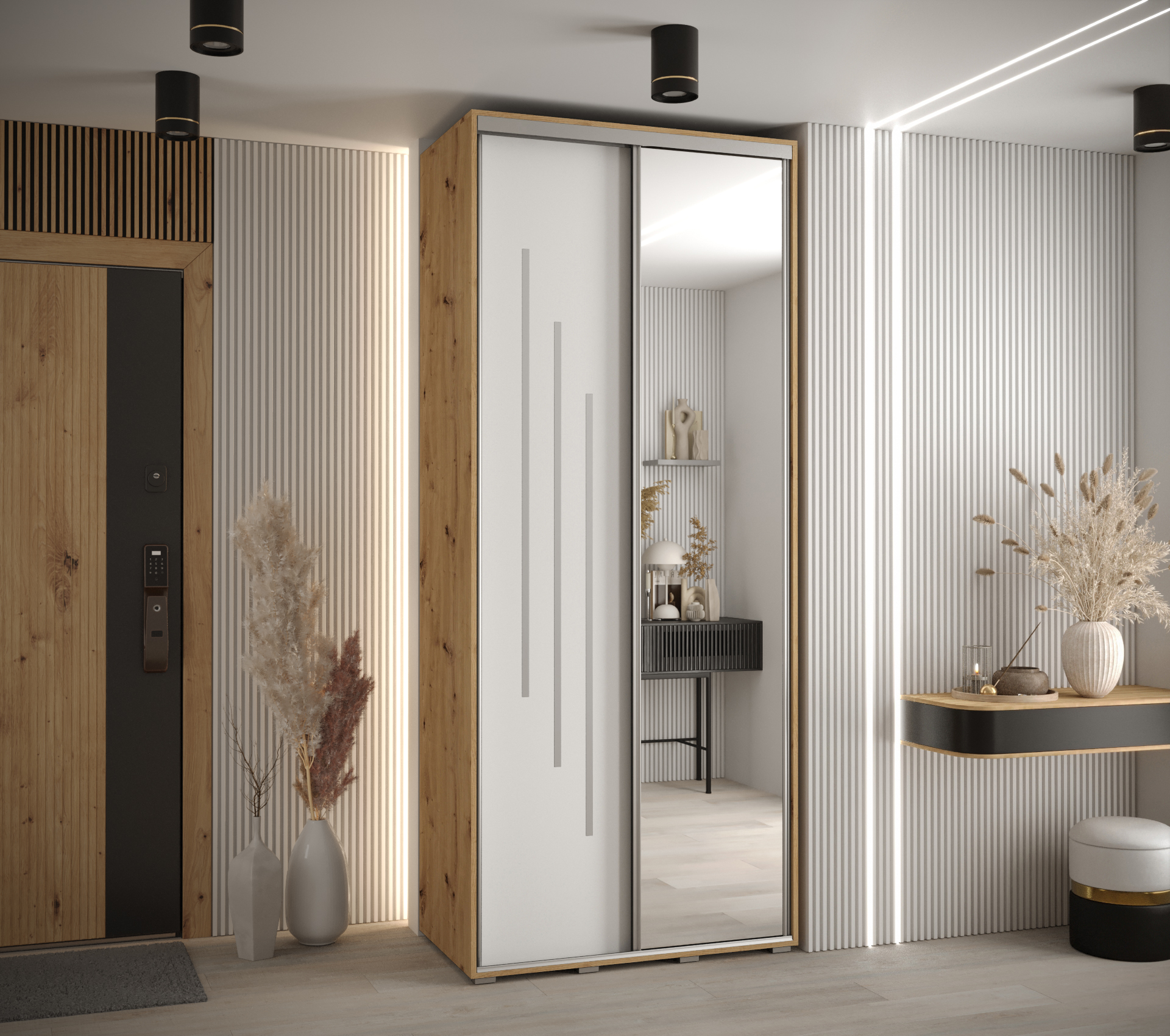 - Vnitřní uspořádání: V základní variantě skříň obsahuje minimálně dvě výsuvné tyče a několik polic, které lze variabilně uspořádat podle vašich potřeb.