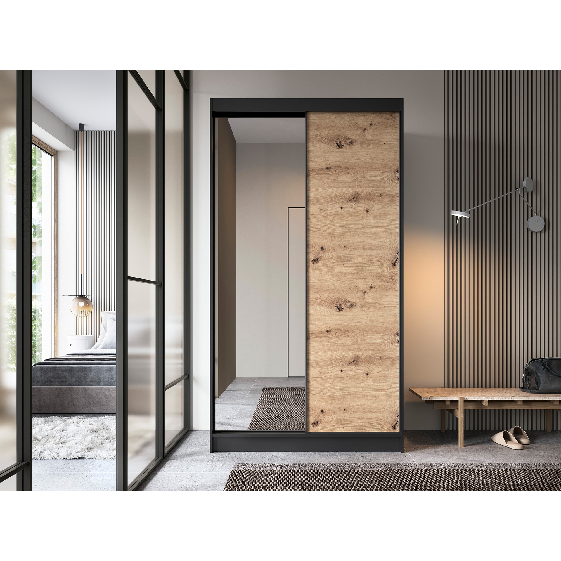 Šatní skříň Esville II je v elegantní černé barvě, která se skvěle doplňuje s dveřmi v odstínu dub artisan. Tento kontrast dodává skříni na atraktivitě a zajišťuje, že se hodí do různých stylů interiéru.