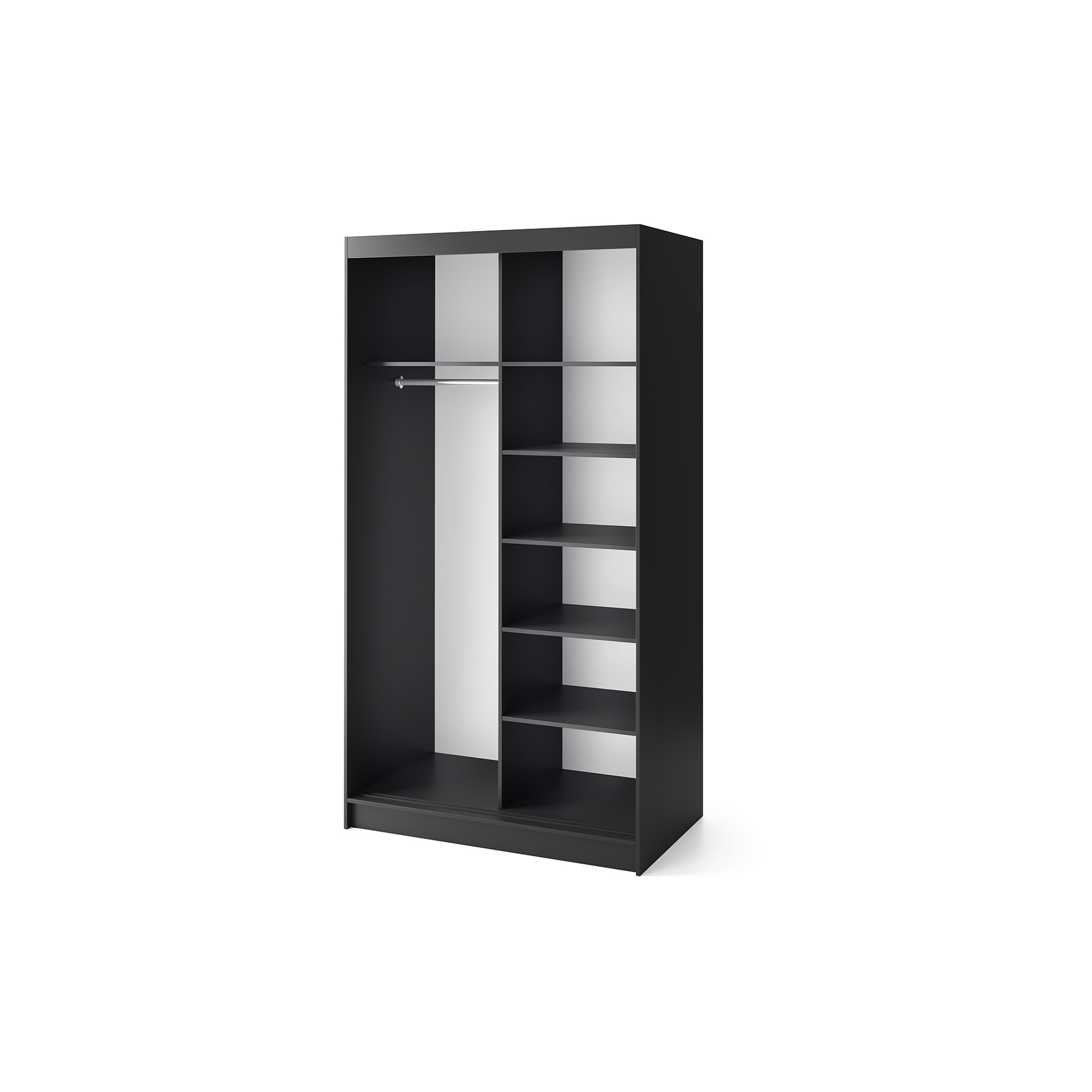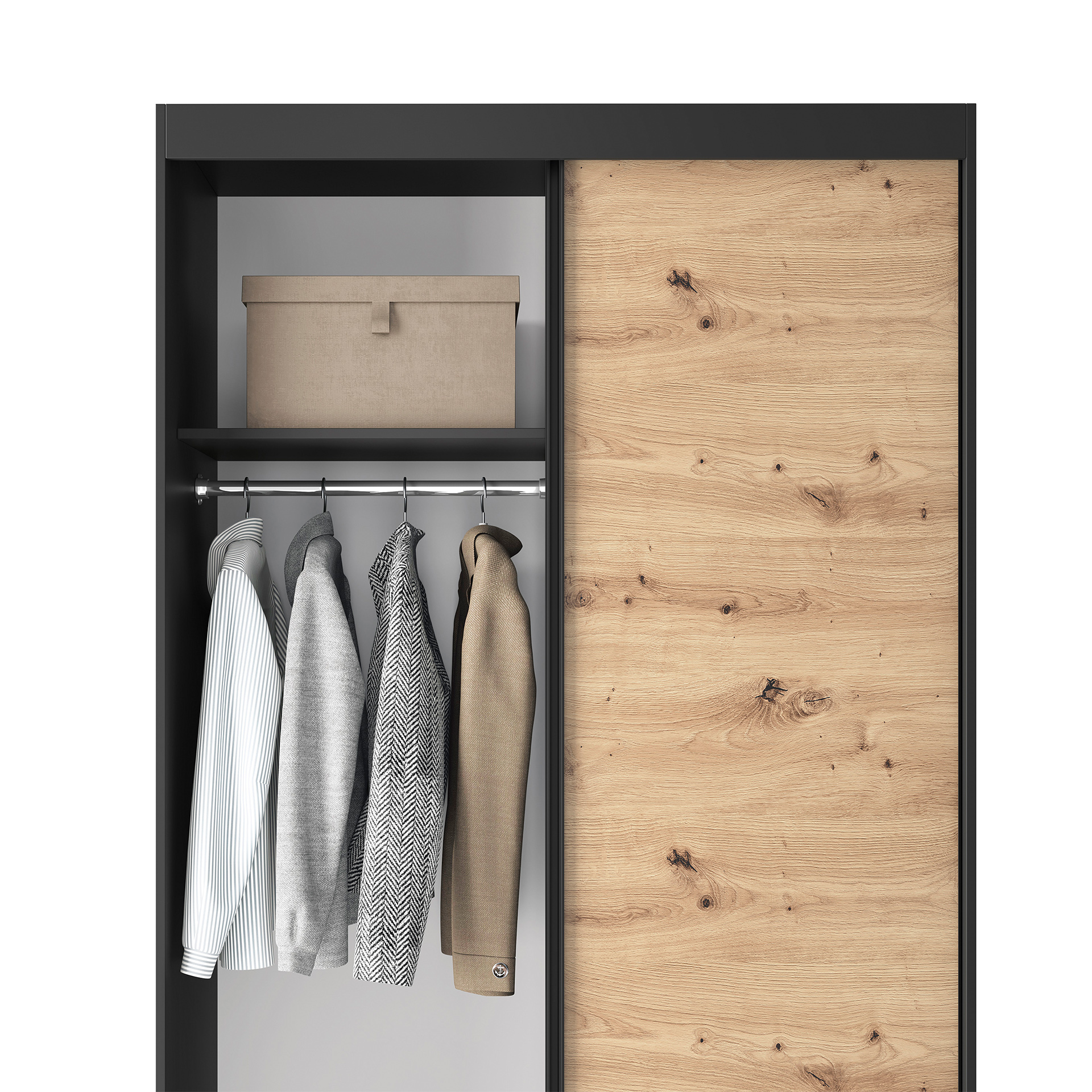 Vnitřní prostor skříně je rozdělen na šatní tyč a police, což zajišťuje efektivní organizaci vašich oděvů a doplňků. Tímto způsobem budete mít vše na dosah ruky a přehledně uspořádané.