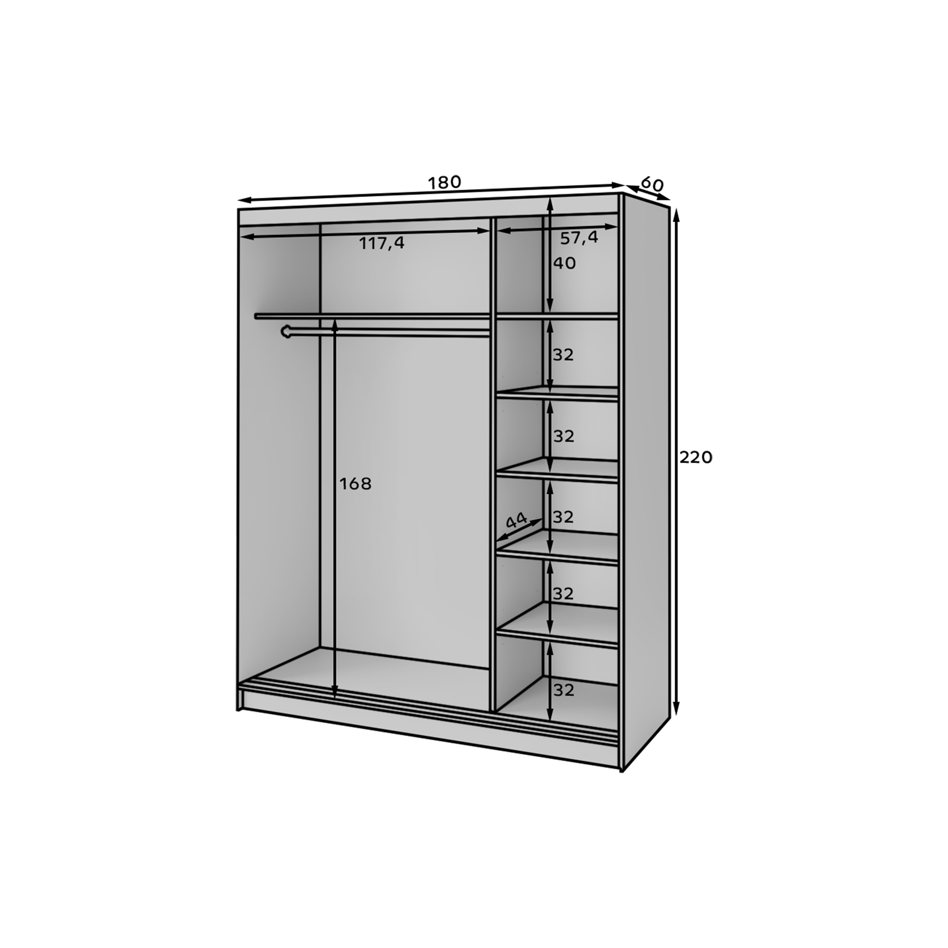- Kvalitní materiály: Korpus i posuvné dveře jsou vyrobeny z laminované dřevotřískové desky o síle 16 mm, což zaručuje dlouhou životnost.