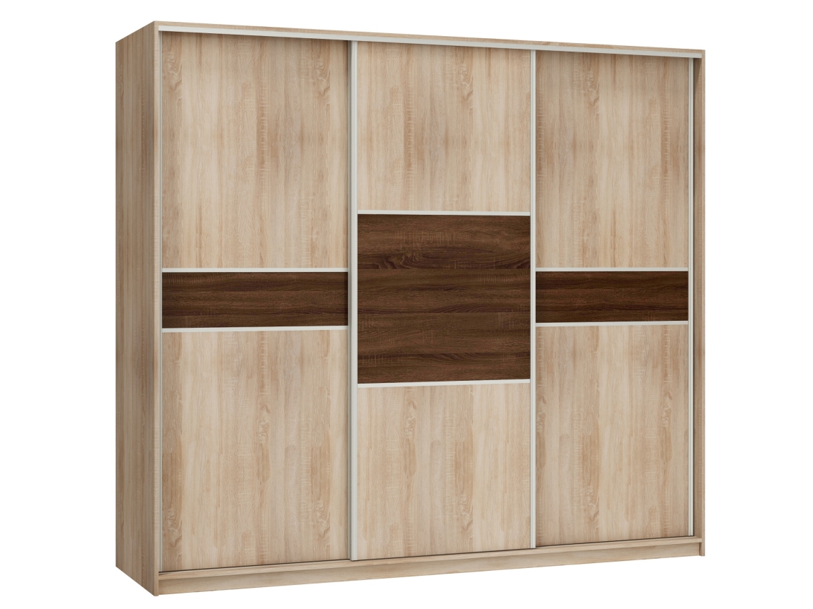 Skříň je navržena v moderním stylu s atraktivním provedením v barvě dub sonoma a tmavého dubu sonoma. Tato kombinace barev přidává do vašeho interiéru příjemnou atmosféru a harmonii. Vnitřní členění skříně je prakticky uspořádáno, jak je zřejmé z dalšího obrázku, což usnadňuje organizaci oblečení a doplňků.