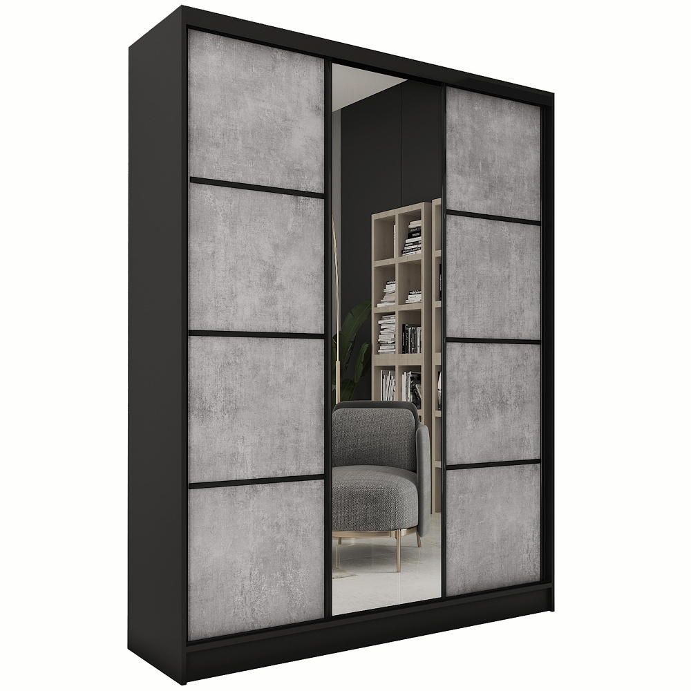 Skříň je vyrobena z kvalitního lamina v atraktivním provedení černý mat/beton. Díky posuvným dveřím šetří prostor a je skvělou volbou pro moderní bydlení. Ozdobné lišty na dveřích můžete snadno demontovat, což umožňuje mít skříň s hladkým povrchem, který se skvěle hodí do minimalistického interiéru.