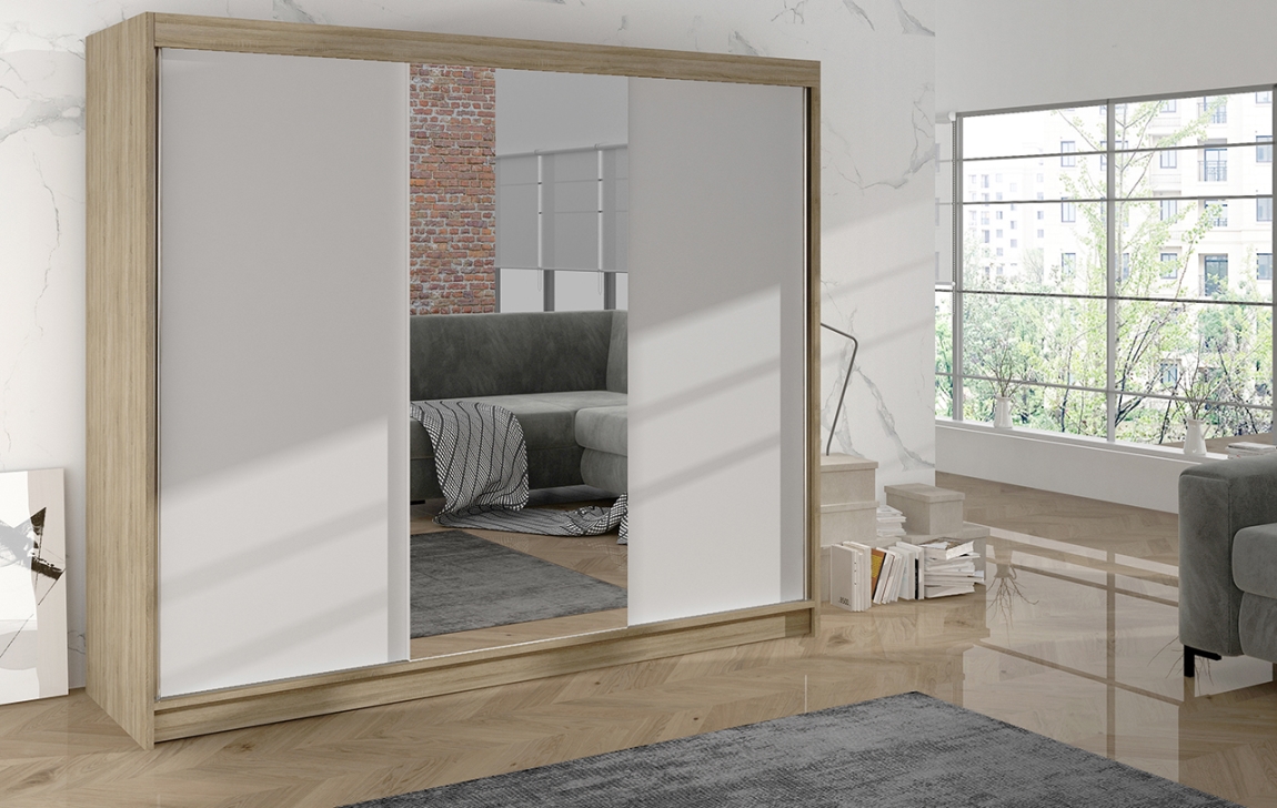 Skříň je navržena v moderním stylu s barevnou kombinací dub sonoma a bílá, která snadno zapadne do různých interiérů. Hliníkové kolejnice Sevroll zaručují plynulé otevírání a zavírání dveří, což přispívá k celkovému komfortu při používání. Úchyty ve formě hliníkové lišty nejenže dodávají skříni elegantní vzhled, ale také zabraňují ohýbání dveří, což je další výhodou tohoto produktu.