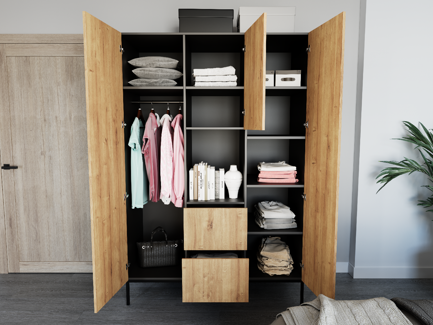 - Nožičky: Kovové nohy v černé barvě dodávají skříni stabilitu a elegantní vzhled.
