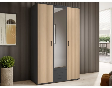 Šatní skříň Laurie představuje ideální volbu pro ty, kteří hledají moderní a funkční prvek do svého interiéru. S šířkou 120 cm je dostatečně prostorná a zároveň kompaktní, což ji činí vhodnou i do menších prostorů. Její elegantní design kombinuje tmavý grafitový odstín s přírodními dubovými lamelami, což vytváří harmonickou atmosféru v každém pokoji.