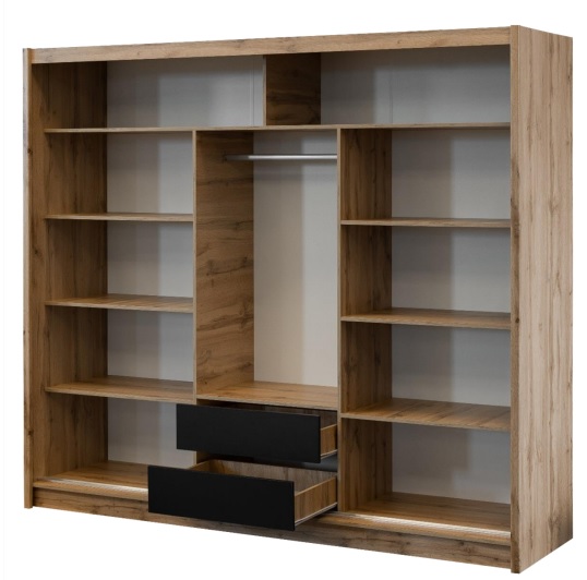 - Šířka 250 cm: Na levé a pravé straně jsou police, zatímco uprostřed se nachází šatní tyč s dvěma zásuvkami pod ní.
