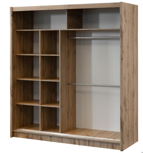 - Šířka 203 cm: Levá strana obsahuje několik polic, pravá část disponuje dvěma šatními tyčemi a horní policí.