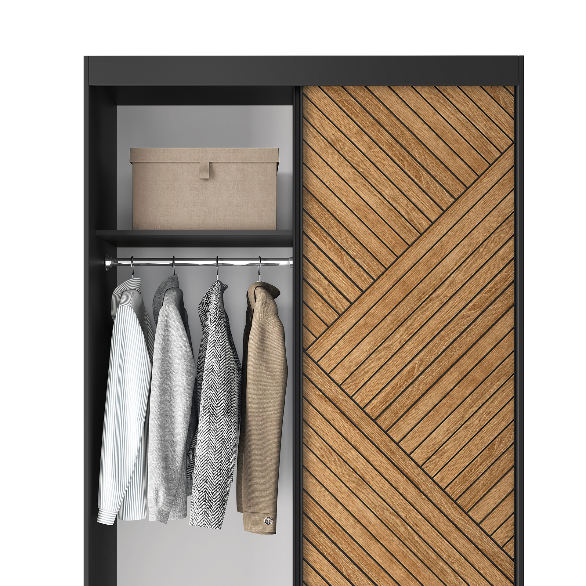 Šatní skříň Marrphy II je k dispozici v elegantní černé barvě, doplněné o ozdobné dveře v odstínu dub caramel. Tento kontrast dodává skříni moderní vzhled a umožňuje snadné sladění s různými styly interiéru.
