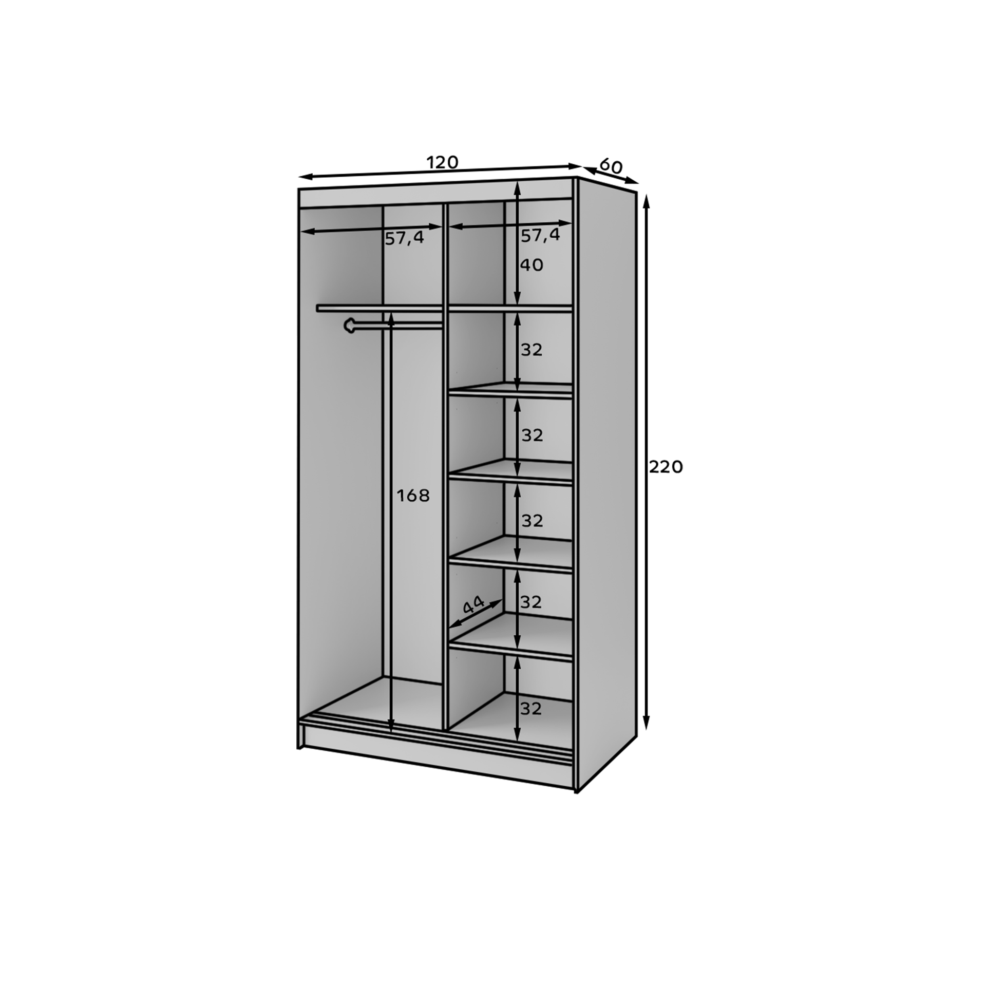 Vnitřní uspořádání zahrnuje šatní tyč a police, což poskytuje dostatek prostoru pro uskladnění oblečení a dalších osobních věcí. Díky posuvným dveřím šetříte místo a usnadňujete přístup k obsahu skříně.