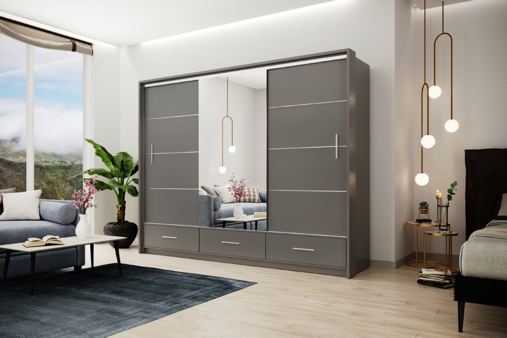 Šatní skříň Marsylia představuje ideální řešení pro ty, kteří hledají stylový a praktický nábytek do svého domova. S rozměry 255 cm a moderním grafitovým matným provedením se stane skvělým doplňkem každého interiéru. Její design zaujme nejen svými ozdobnými lištami, ale také LED páskem umístěným nad posuvnými dveřmi, který dodává skříni nádech elegance.