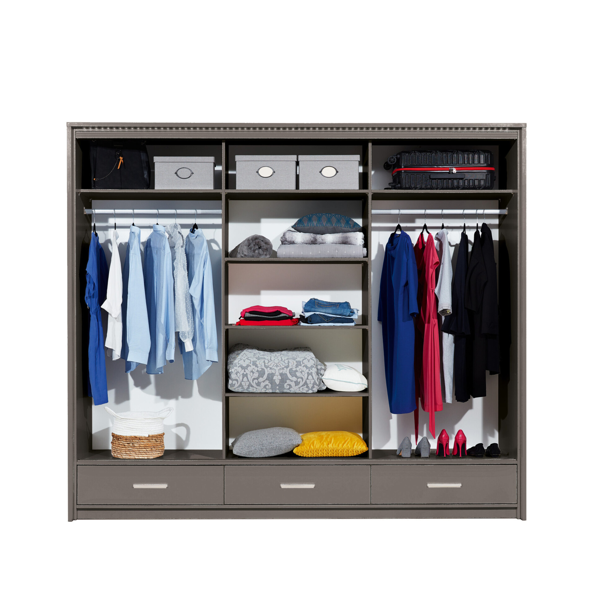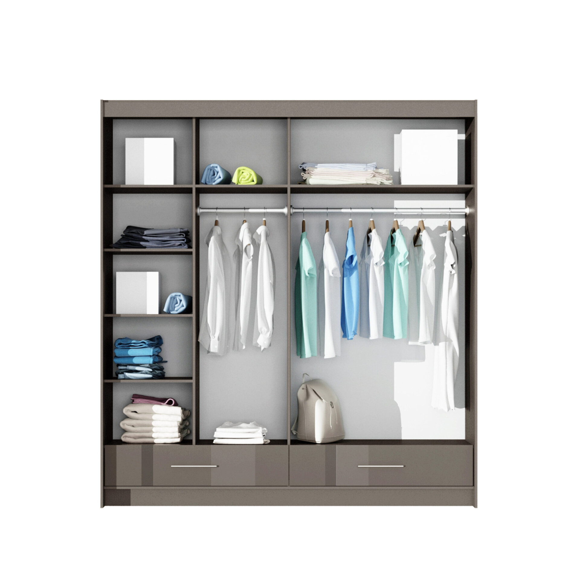 Šatní skříň Marsylia je navržena tak, aby maximálně využila dostupný prostor. Na levé straně se nachází několik polic, zatímco uprostřed a na pravé straně jsou umístěny dvě šatní tyče a nad nimi další police. Ve spodní části skříně naleznete tři prostorné zásuvky, které jsou ideální pro uskladnění drobných předmětů.