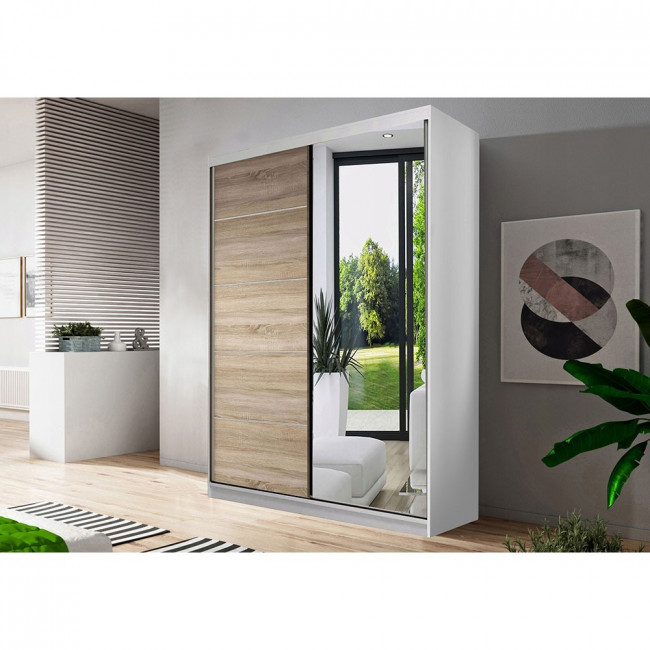 Posuvné dveře skříně jsou navíc doplněné o zrcadlo, které opticky zvětšuje prostor a nabízí praktické využití.