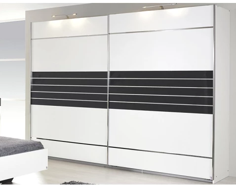 - Typ dveří: Posuvné s zrcadlovými a šedými pruhy.