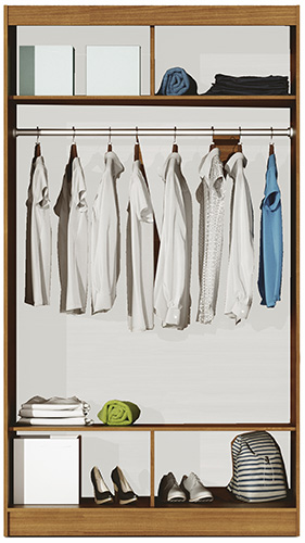 - Šířka 160 cm a 203 cm: Levá strana nabízí několik polic, pravá část je vybavena dvěma šatními tyčemi a nad nimi polici pro další úložný prostor.
